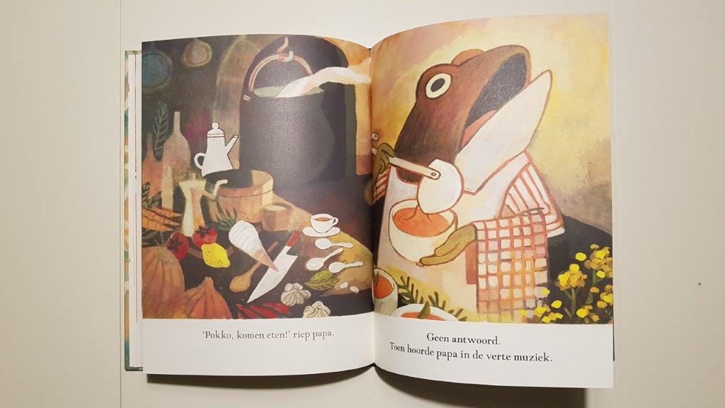 Het bleef stil in huize kikker toen het eten klaar was en papa Pokko riep. In de verte hoorden papa en mama wel muziek. En het kwam steeds dichterbij. Zelfs zo dichtbij dat de dieren uit de stoet papa en mama (met boek en al) optilden en meenamen in de muziekmenigte. Uiteindelijk vonden ze het toch wel mooi.