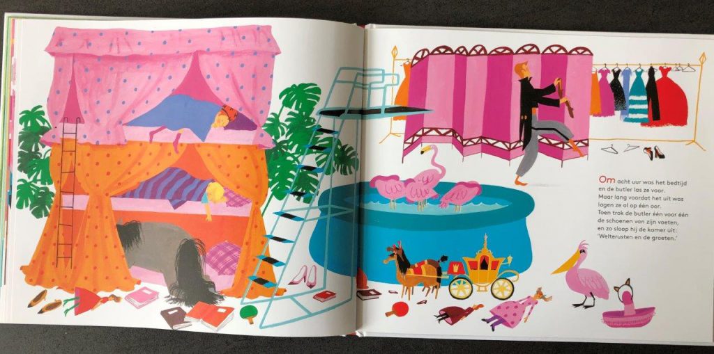 Pomtidom en de prins op het mottige paard is het tweede verhaal over de prinses Pomtidom, geschreven door Kim van Kooten. Een mooi verhaal in dichtvorm geschreven. Als je dit als volwassene zit te lezen krullen af en toe ook je mondhoeken omhoog. Wat te denken van de zin: “vandaag was heel belangrijk, want vandaag kreeg ze bezoek van Tobias de Blonde, uit het rijk links om de hoek.” Geweldig gevonden toch? Of tijdens het trouwen: “En Pom die was de bruidegom en Tobias de bruid. Pom zei: Die hoed staat mij wel goed, maar jij ziet er niet uit.” Dat vind ik komisch.