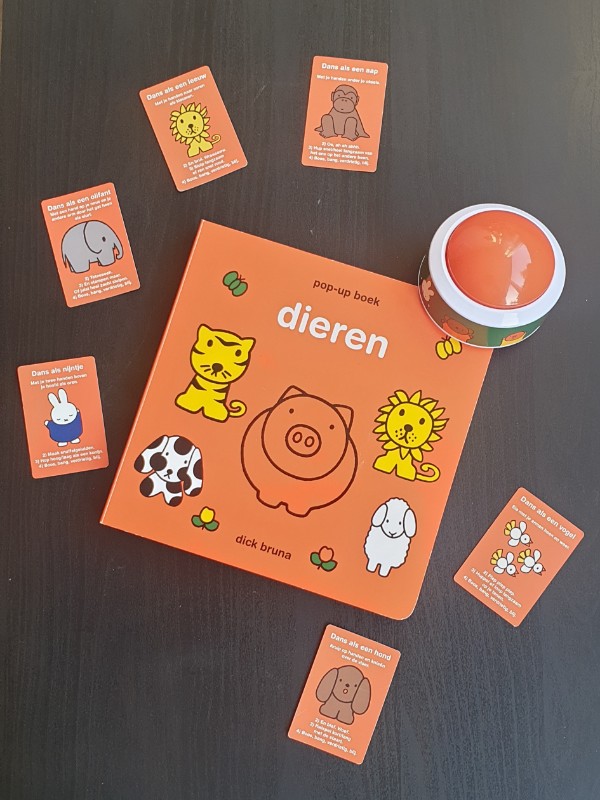 Pop-up boek dieren is super leuk te combineren met de dierenkaartjes uit het spel nijntje stoelendans (Bol). Hierbij worden kinderen uitgenodigd om te dansen als een bepaald dier. Wanneer je dit spel niet hebt kun je de kinderen zelf dieren laten verzinnen. Spreek van te voren af als welk dier jullie gaan dansen en zet een vrolijk muziekje op. Plezier gegarandeerd!