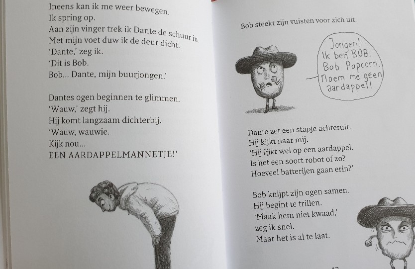Bob Popcorn heeft veel illustraties, waarbij de tekst en het beeld elkaar aanvullen. Het zit een beetje tussen een graphic novel en een leesboek in.
