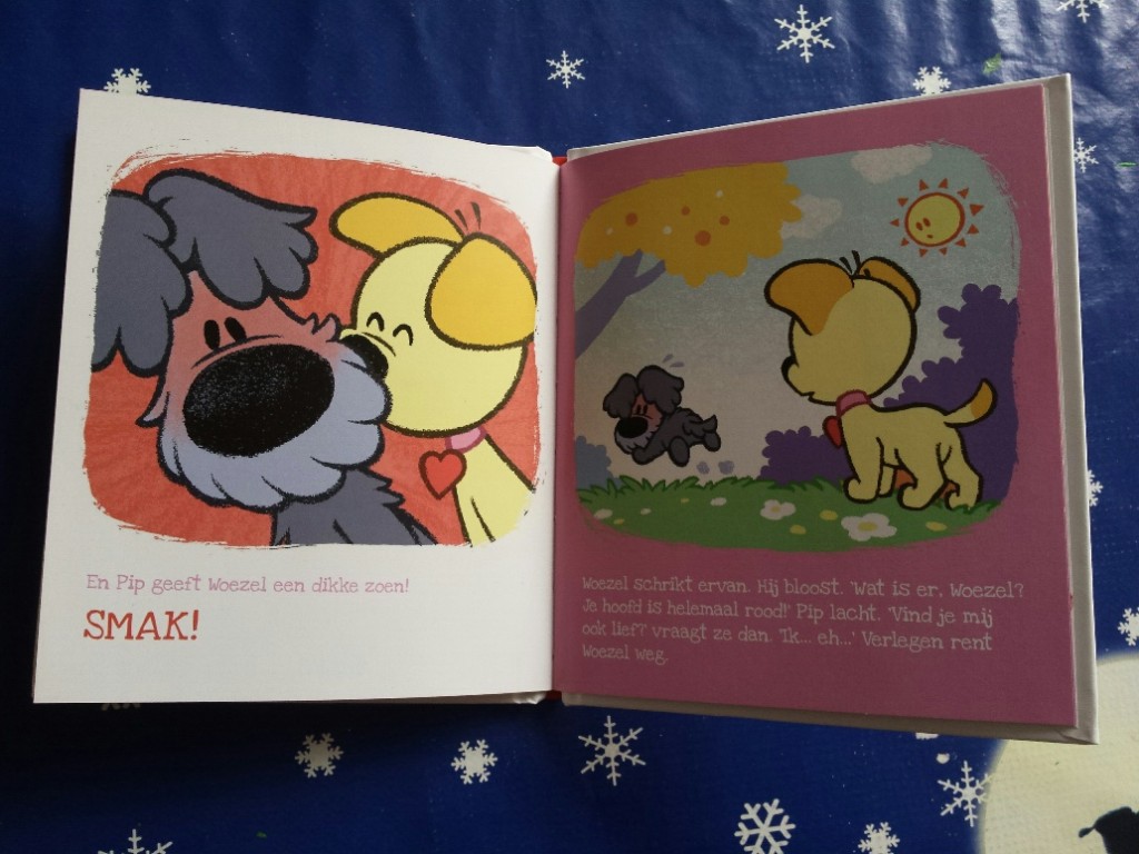 Ik vind dit zo’n onwijs schattig voorleesboekje om te lezen. Woezel besluit om iedereen in de tovertuin te vertellen hoe lief hij ze vindt. Als Pip hem voor is en hem verteld hoe lief zij hem vindt en hem een zoen geeft wordt hij knalrood en rent ervan door en verstopt zich overal. Uiteindelijk vertelt hij Pip dat hij haar het allerliefste vindt en geeft ook haar een zoen waardoor ook Pip knalrood wordt.