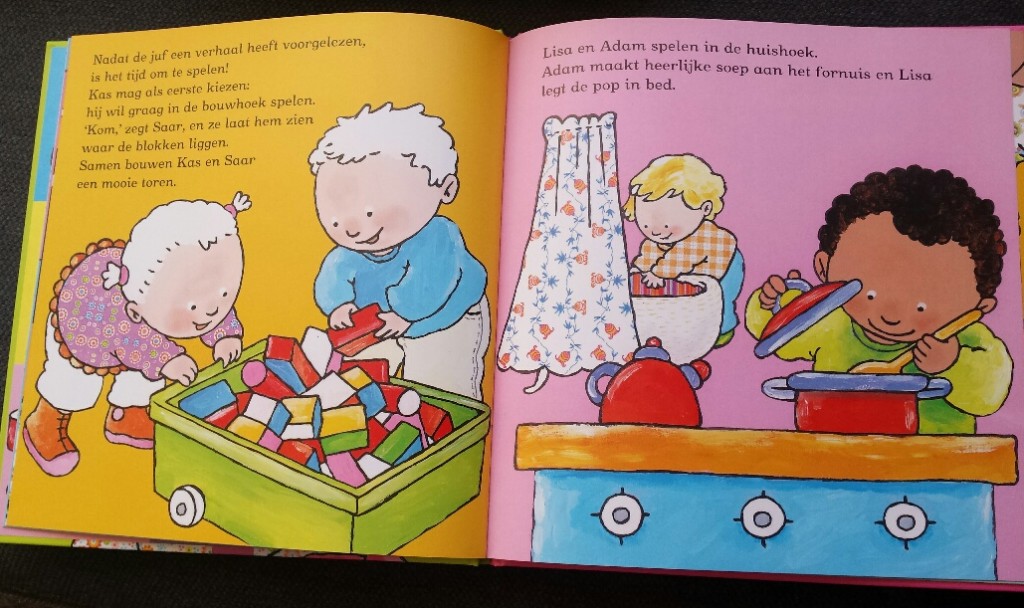 Ik denk vooral een geschikt prentenboek naar school voor kinderen die nog niet goed Nederlands spreken en zo met weinig tekst de belangrijkste woorden leren.