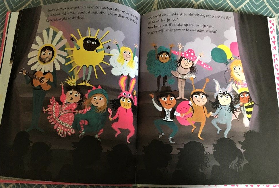 Het verhaal van Prinses Kevin zoals mijn Oudste van zeven jaar dat voorlas aan mijn Jongste van vijf jaar verliep als volgt. Kevin is een jongen, maar Kevin wil graag als prinses verkleed naar school gaan tijdens het schoolfeest. Iedereen gaat verkleed. De één als cowboy, de ander als dinosaurus. Anderen zijn weer ridder, piraat, eenhoorn, konijn, kikker, paddenstoel, zon of… prinses. Zoals Kevin. Hij trekt een prachtige lange roze jurk aan. Hij doet make-up op van zijn moeder. Van zijn zusje mag hij de hakschoentjes lenen. Dan gaat hij naar school. En daar kijken ze nogal raar op van prinses Kevin.