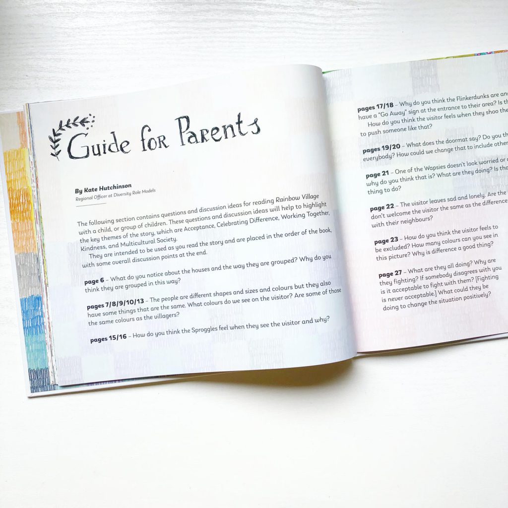 De illustraties zijn prachtig van Rainbow Village. Mijn moeder had vroeger speciale pastel potloden die ik soms mocht gebruiken. En daar doet me dit aandenken. Alsof het vers getekend is. Soms moet ik gewoon even de bladzijde aanraken en voelen of het wel echt geprint is. Het thema diversiteit, jezelf zijn, acceptatie en begrip worden op een leuke speelse manier verwoord. Achterin staat een gids voor ouders met vragen die je kan stellen per bladzijde. Uiteraard zie ik hier ook meteen kansen in als leerkracht of pedagogisch medewerker. En aansluitend nog wat algemene vragen die je kan stellen en uitleg over Diversity Role Models.