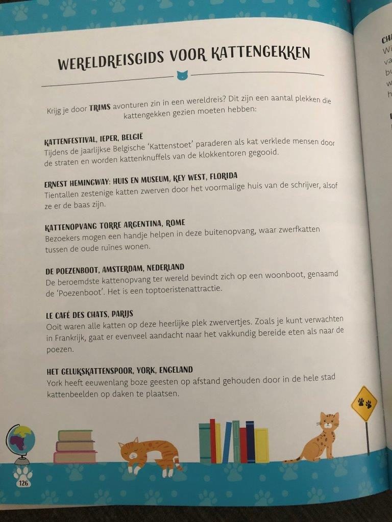 Achterin het boek vind je weer een tijdlijn maar nu met verschillende soorten katten. Zoals de scheepskat uit 1797, balletster uit 1960 en de presidentiële kat uit 1990. Ook handig is de verklarende woordenlijst achterin het boek want niet alle woorden kende ik. Wat ik leuk vond was de quiz in het boek. Die kan je ook voor je spreekbeurt goed gebruiken. En kan je nog geen genoeg krijgen van katten, is er een boekenlijst te vinden met vele katten verhalen en een lijst met diverse websites met katten in de hoofdrol.