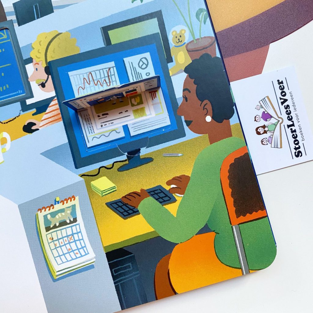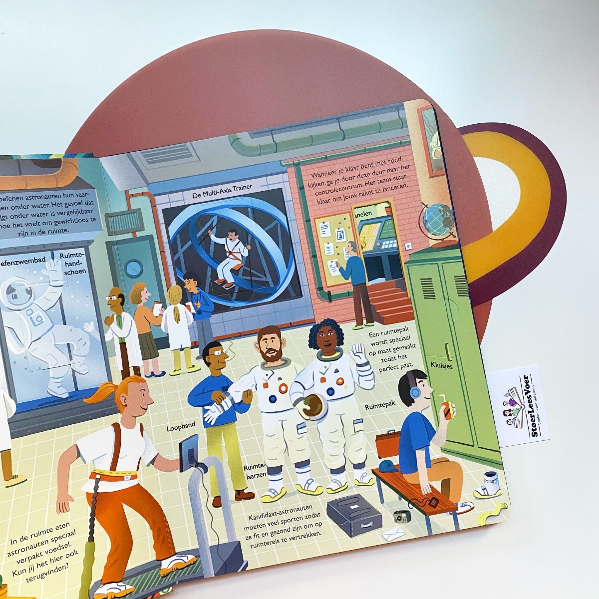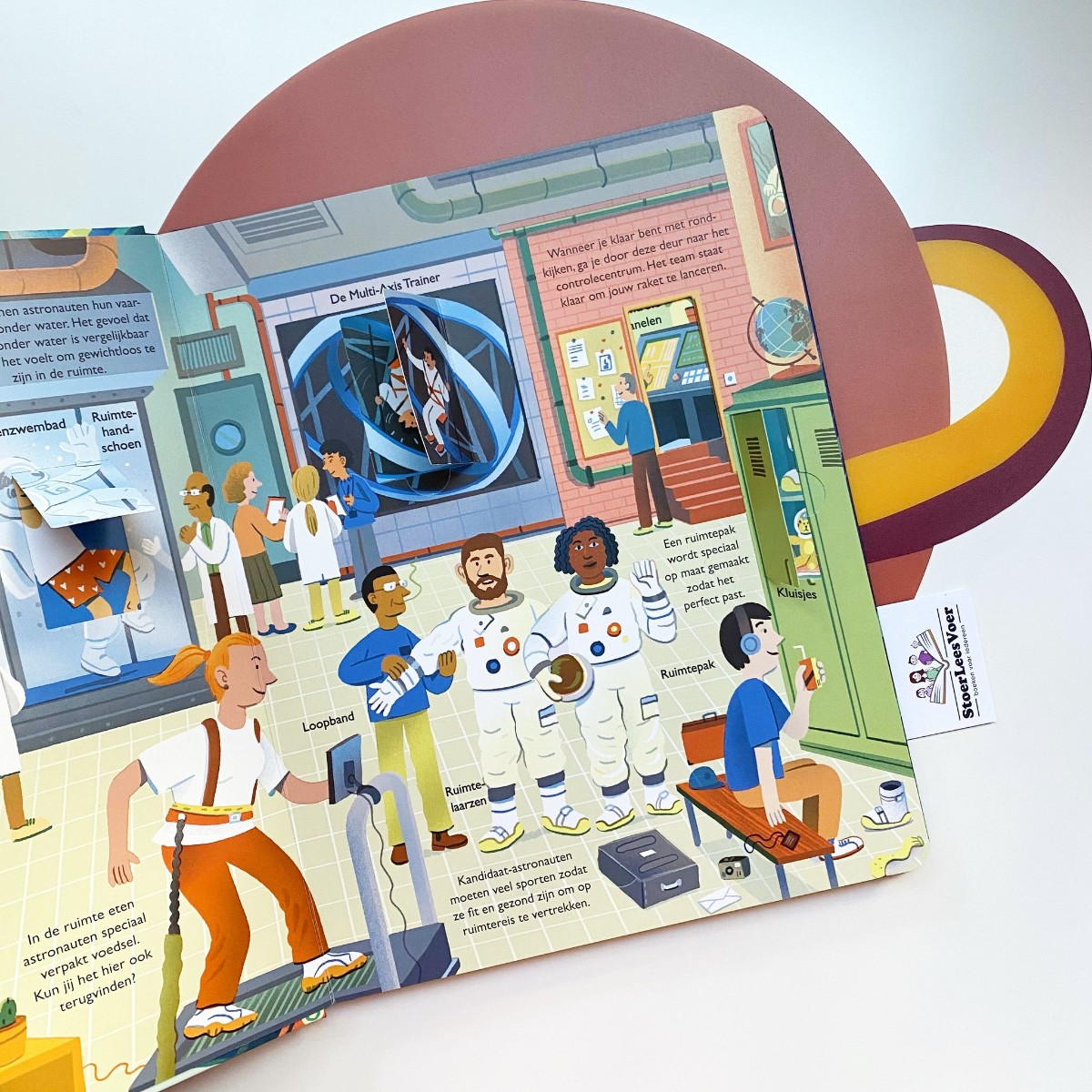 Dit hardkartonnen boek heeft een stevige kaft en stevige pagina’s. De flapjes (meer dan 20) hebben handige uitkepingen waardoor ze makkelijk openen. De tekeningen zijn vriendelijk en de personages zijn divers. Elke huid- en haarkleur komt wel voorbij. Ook is de balans tussen mannen en vrouwen prima. Reis door de ruimte is dus echt een ruimteboek van nu. En naast de weetjes zit er dus ook een zoekelement in, heel tof!