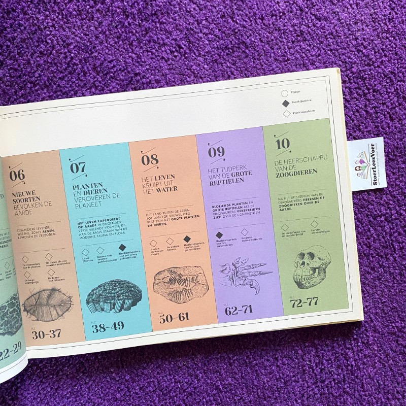 Na toch wel een tijdje in de schutbladen door te brengen, droom ik ook even weg in het titelblad. Het geeft me een gevoel van dromen en geeft ook een gevoel van in beweging zijn. Het voelt echt alsof ik op reis vertrek. De inhoudsopgave is helder; er staat bij vermeld welk onderwerp besproken wordt. Ook staat erbij wat je kan verwachten aan tijdlijn, doorkijkplaten en/of panoramaplaten. Reis door de tijdperken heeft het allemaal. Het is een actieve vakantie waar veel in gebeurt, maar waar toch orde en overzicht is. Dat leest en ontdekt zo aangenaam, wat mij betreft. Wat er niet bij vermeld staat, is dat dit boek dus ook verstopte flapjes heeft, zoals op bladzijde 7 en 9. Dat is nog eens een aangename verrassing.