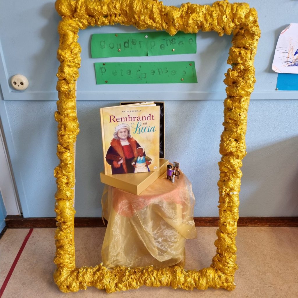 Op dit moment werken wij op school over kunst. Ideaal dus dat Rembrandt en Lucia op mijn deurmat viel. Er begint zich al een heus museum te ontwikkelen bij de kleutergroep. Mondriaan, Kandinsky, Appel, Van Gogh. Natuurlijk mag Rembrandt van Rijn hier niet ontbreken. We hebben het boek dan ook direct in gebruik genomen op school. Zie je het staan schitteren in het museum van ‘Peter Penseel?’ Deze ‘kunstenaar’ heeft de kleuters van de Vlindertuin namelijk gevraagd te helpen bij het maken van een kunstcollectie.