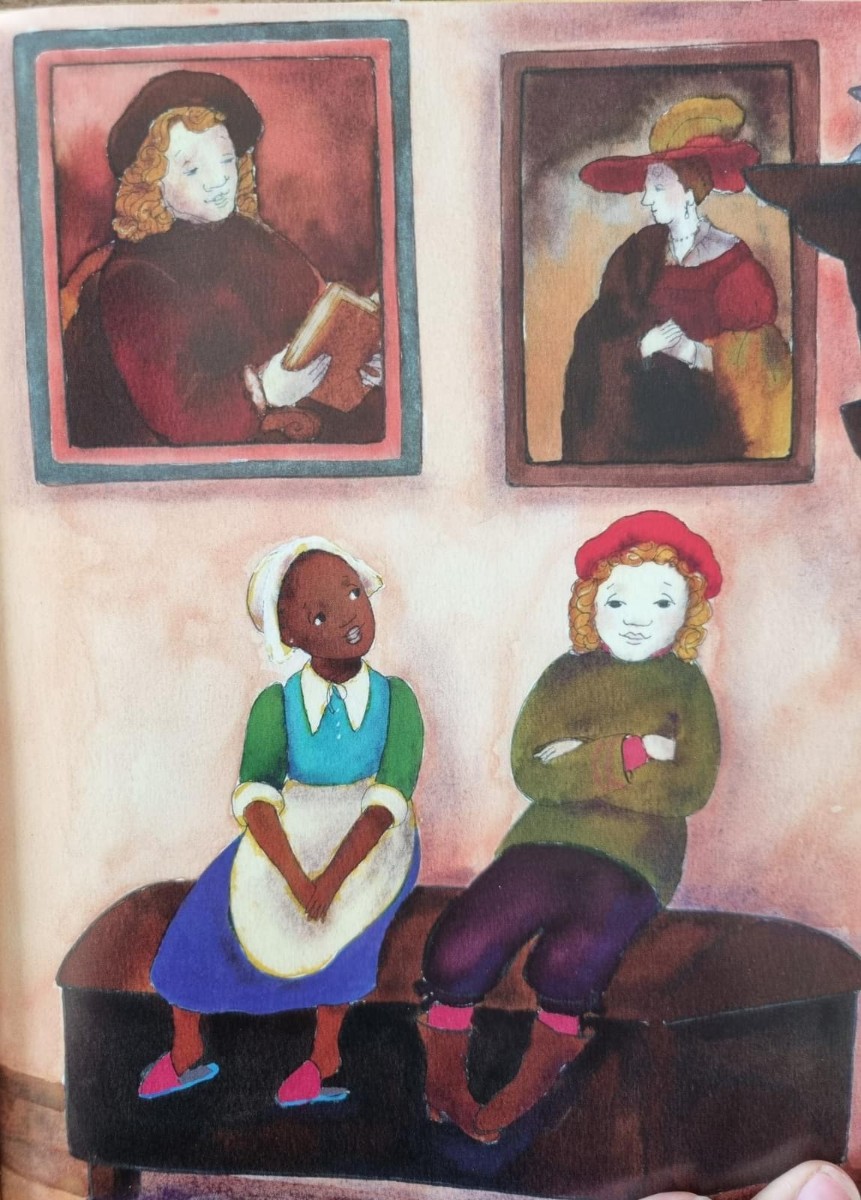 Bij de start van Rembrandt en Lucia maken we kennis met Lucia. Ze zit voor de deur bij Rembrandt van Rijn te wachten. Direct vallen de illustraties mij op. Ze zijn herkenbaar voor Mylo Freeman, die ik vooral ken van het boek Tweeling, Potje en Prinses Arabella. In die laatste serie maakte ze overigens ook een boek over kunst. Ze heeft een schilderachtige stijl, waarbij met name de schaduwen het kleurgebruik kenmerkend zijn.