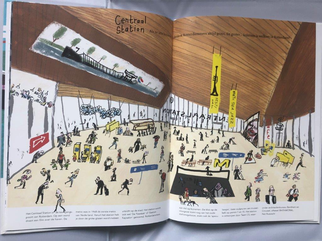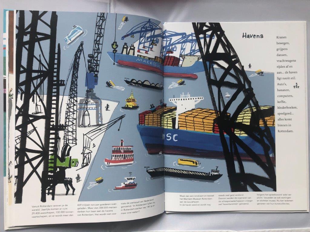 Past ook wel meer bij een stad als Rotterdam denk ik. Het is ook een toegankelijke manier voor kinderen. Dat is ook nog een pluspunt van dit prentenboek. Het is zo gemaakt dat het geschikt is voor kinderen én volwassenen. Je kan alleen de prenten bekijken, maar ook de tekstjes lezen. Een deel over de geschiedenis, in meer kleinschrift, en een deel ‘wetenswaardigheden’ in meer groter lettertype. Dat maakt samen dit boek bekijken en erover praten extra leuk.