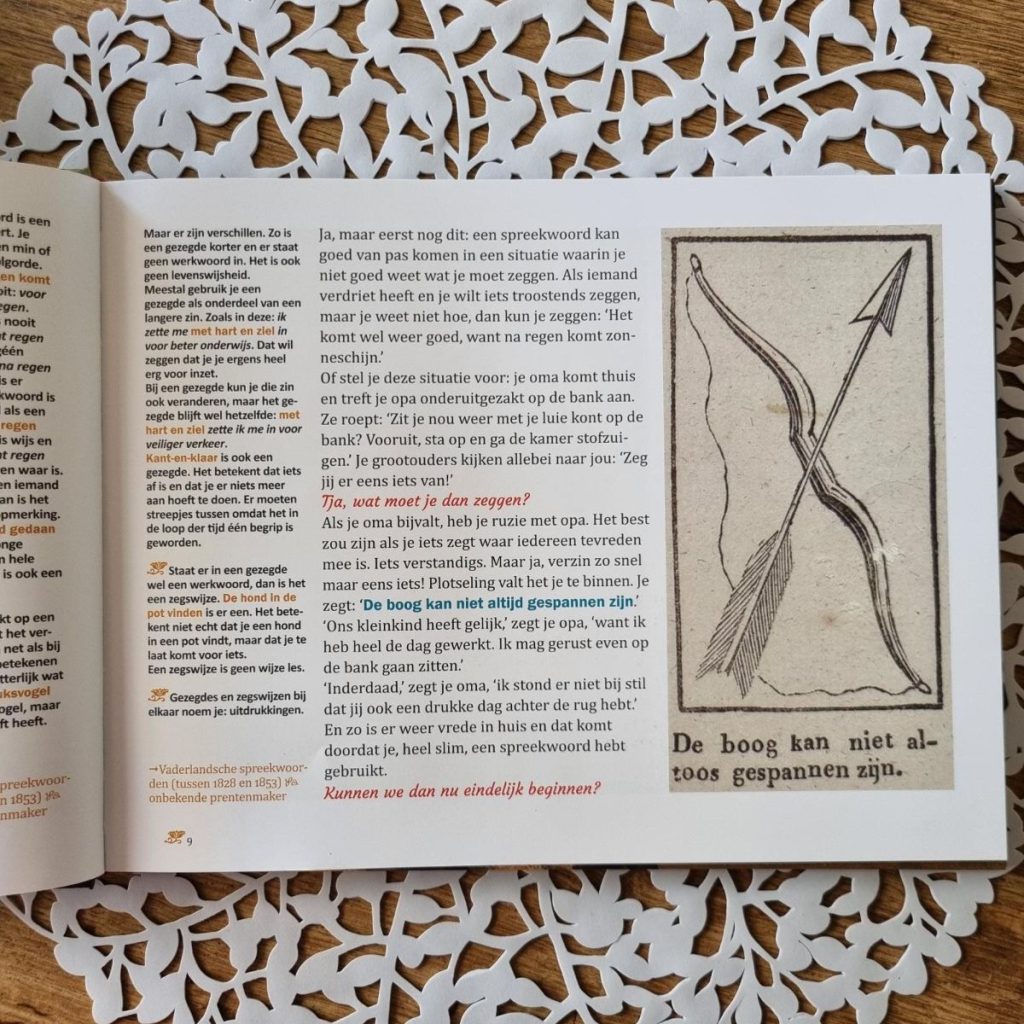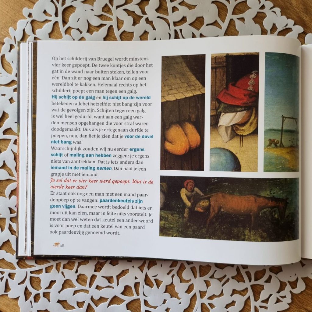 Zoals gezegd, Rozen voor de zwijnen staat vol spreekwoorden. Een heel aantal kende ik er al, maar er staan er zo’n 100 op dus zeker niet allemaal! Bijvoorbeeld: Daar hangt het mes uit of Paardenkeutels zijn geen vijgen. Kende jij deze ook niet? Dan moet je gauw het boek gaan lezen, want Ted van Lieshout laat je er beeld bij zien EN zorgt voor een uitleg. Het beeld er bij komt vanuit het schilderij ‘De verkeerde wereld’ en allerlei andere bronnen die Van Lieshout heeft gezocht bij de spreekwoorden.