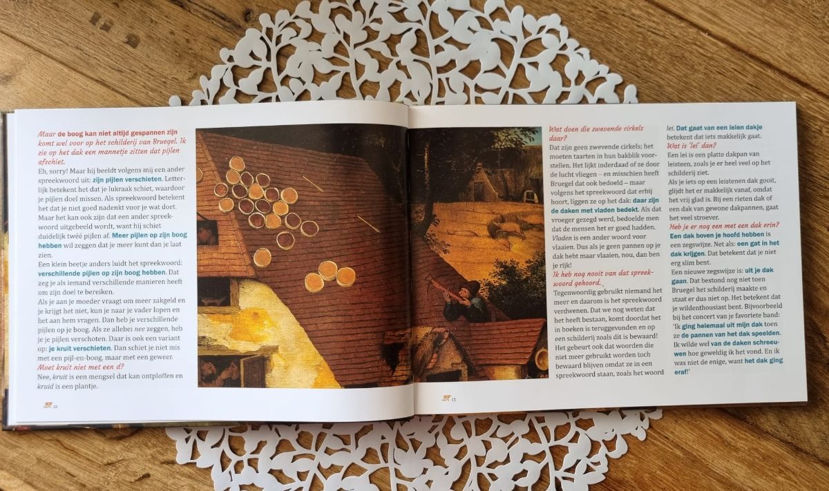 Het leuke van Rozen voor de zwijnen is dat het grote schilderij wordt opgedeeld in hele kleine details. Dit maakt dat je lang naar het schilderij blijft kijken en dat je ook naar volgende schilderijen een meer gedetailleerde kijkhouding krijgt. Het is ook erg leuk om kinderen, en dat kunnen al heel jonge kinderen zijn, de detailafbeeldingen te laten zoeken in het grote schilderij. Ook is het tof om kinderen spreekwoorden te laten raden. Welke denk je terug te zien op het schilderij van Bruegel? Dit kun je checken in het boek.