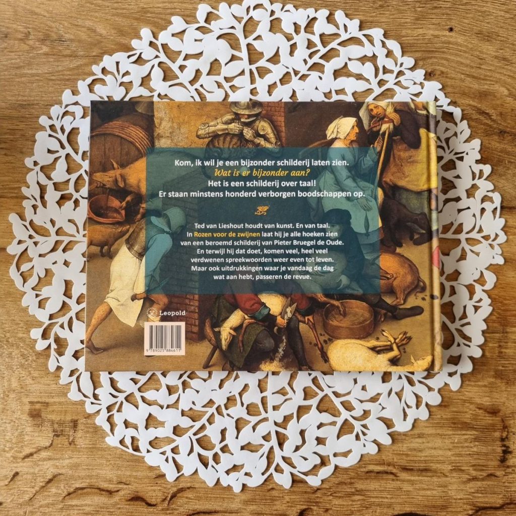 Wat een prachtig boek heb ik hier naast mij liggen. Rozen voor de zwijnen is een boek vol kunst. De schilderijen van Pieter Bruegel bevatten namelijk zoveel taal, zonder woorden. Ted van Lieshout beschrijft op een aansprekende en zeer kenmerkende manier de schilderijen. Voor jong en oud geschikt, voor school en ook voor thuis. Ik laat je er graag iets van zien!