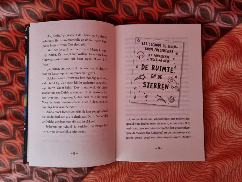 Ik heb een heleboel nieuwe ruimtewoorden geleerd van het boek Ruimtegekte. Een hele opgave moet dit zijn geweest voor de vertaler van het boek Mijke van Leersum. Want weet jij wat een kosmische zone, een P-klasse Planeet en een intergalactisch decor is? Ik niet! Voor kinderen die houden van de ruimte, Star Wars-achtige series en aliëns is dit boek perfect. Christopher Edge weet kinderen te boeien, ook als ze niet zo van lezen houden.