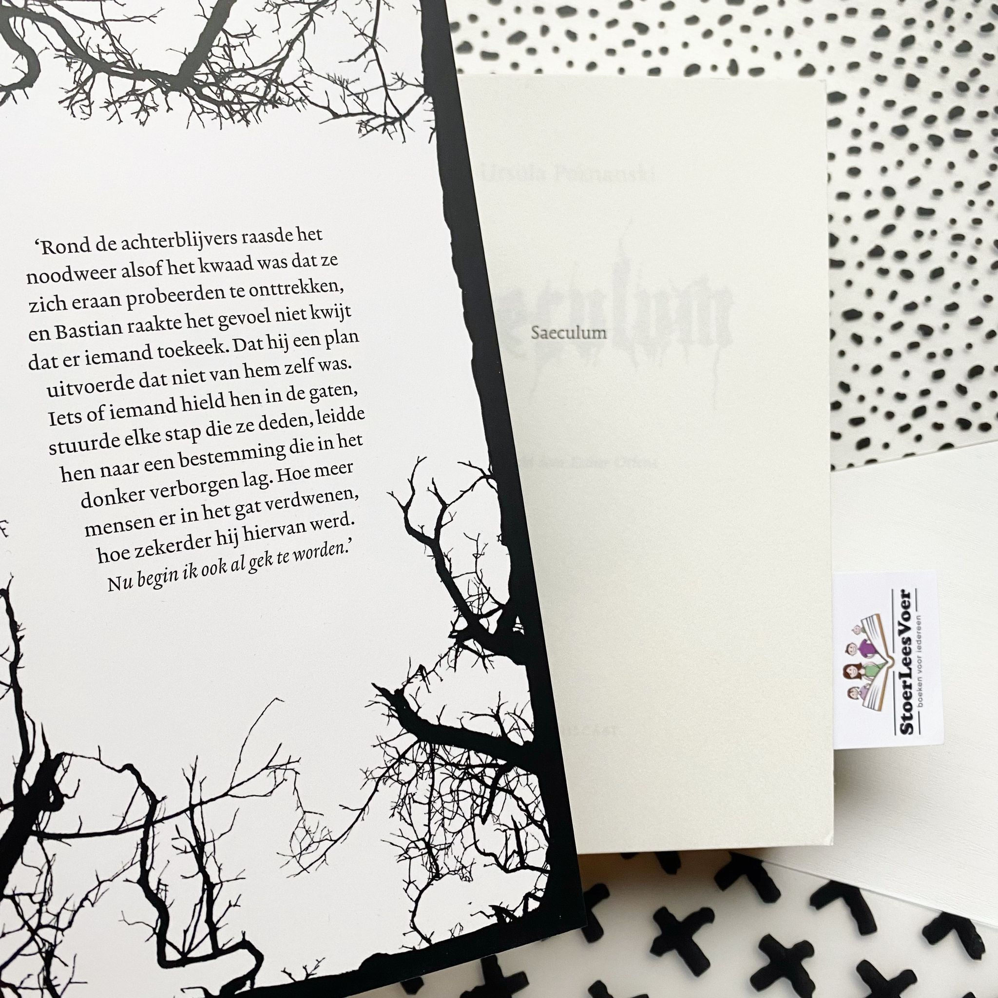 Als ik Poznanski’s boeken lees, dan zit ik direct in haar wereld. En ook als ik het boek sluit, dan is haar wereld er nog. Ik ruik de bomen en de vochtige aarde. Ik zie haar omgeving heel erg beeldend voor me zonder daar moeite voor te hoeven doen. En ik heb zelfs een nachtmerrie gehad tijdens het lezen, waarin ik direct in de situatie zat die er gebeurt aan het einde van Saeculum. Ik verklap niet veel, maar wel dat ik geen claustrofobie heb. En toch was dit zo benauwend. Opgesloten zitten met de gekte en donkere wegen die een mensen geest kan maken in tijden van nood.