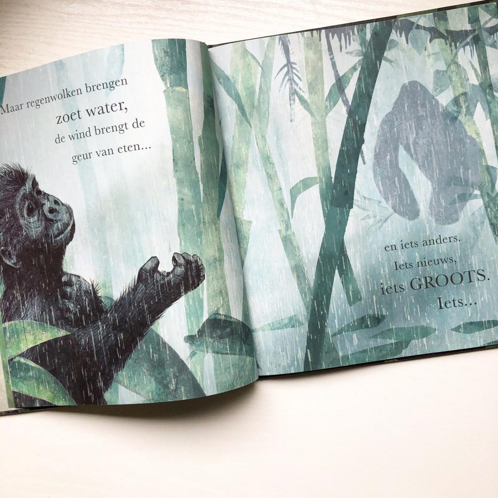 Het verhaal in samen begint met een klein aapje alleen. Het is niet duidelijk waar zijn ouders zijn en waarom het aapje alleen is. Je voelt direct al een bepaalde emotie door de tekst en de illustraties. Zo’n lief klein wezentje hoort toch niet alleen te zijn… En dan wordt het ook nog eens bang. In de verte komt een donkere schaduw dichterbij. Dat is spannend en onze emotie slaat om in spanning en nieuwsgierigheid.