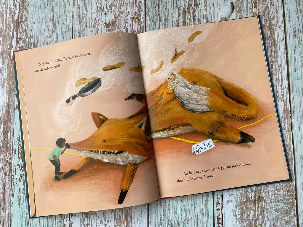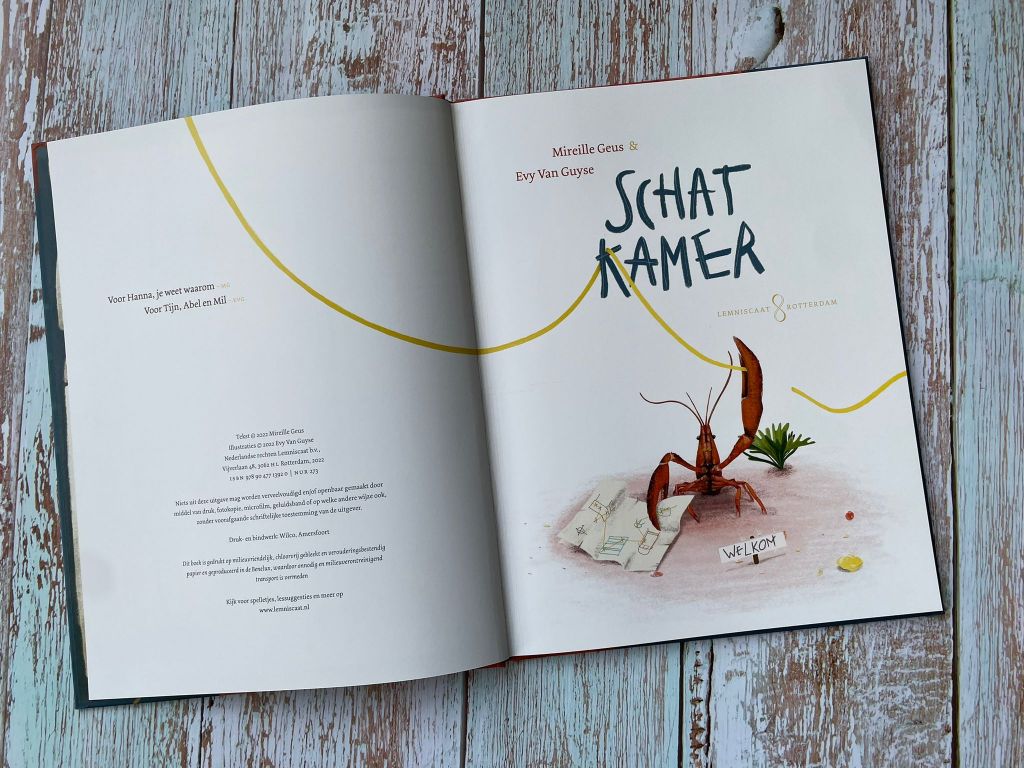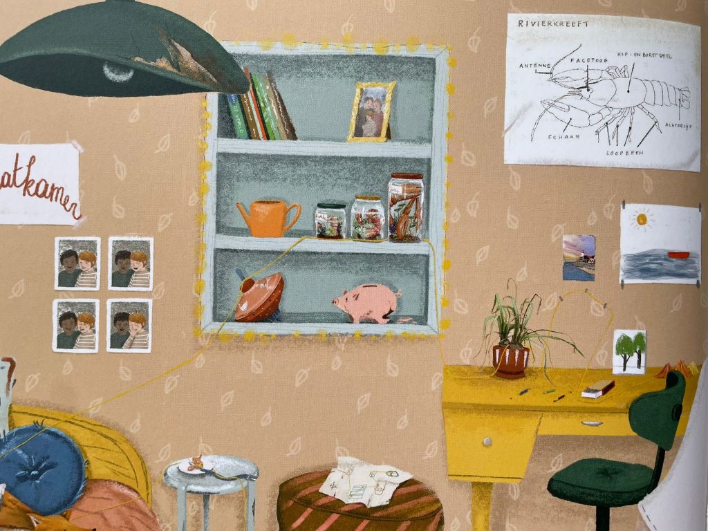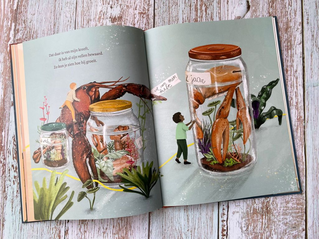 De tekeningen in Schatkamer zijn echt fantastisch. Je ziet namelijk niet alleen de voorwerpen, maar je ziet de herinneringen voor je ogen tot leven komen. De tekeningen zijn heel mooi en gedetailleerd, je ziet echt bijvoorbeeld de haartjes van de versleten knuffel, of de stipjes op de vellen van de kreeft. het ziet er gewoon levensecht uit! De illustraties zijn van Evy Van Guyse, en dit is haar eerste prentenboek. En van mij mogen er zeker nog meer prachtige prentenboeken van haar hand komen!