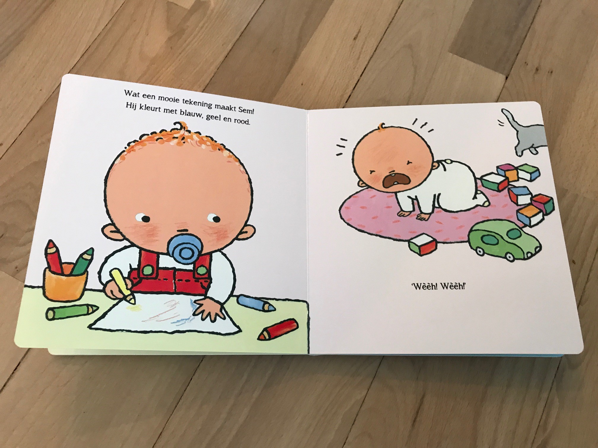 Onze jongste ziet dat niet zitten. Toen zag ik toevallig het boek ‘Sem zonder speentje’. Een medium formaat prentenboek. Groot genoeg om samen in te kijken en niet zo groot dat het onhandig is om vast te houden. De tekeningen zijn eenvoudig, lief en herkenbaar. De tekst is kort en goed te begrijpen voor deze kleine kinderen. De tekeningen en de tekst passen goed bij elkaar. Het lukt mijn dochtertje om het verhaal te volgen en in haar eigen woorden te vertellen aan de hand van de plaatjes. Ze luistert aandachtig naar het verhaaltje. Ze vindt het prachtig hoe de baby steeds getroost wordt en dan weer gaat huilen.