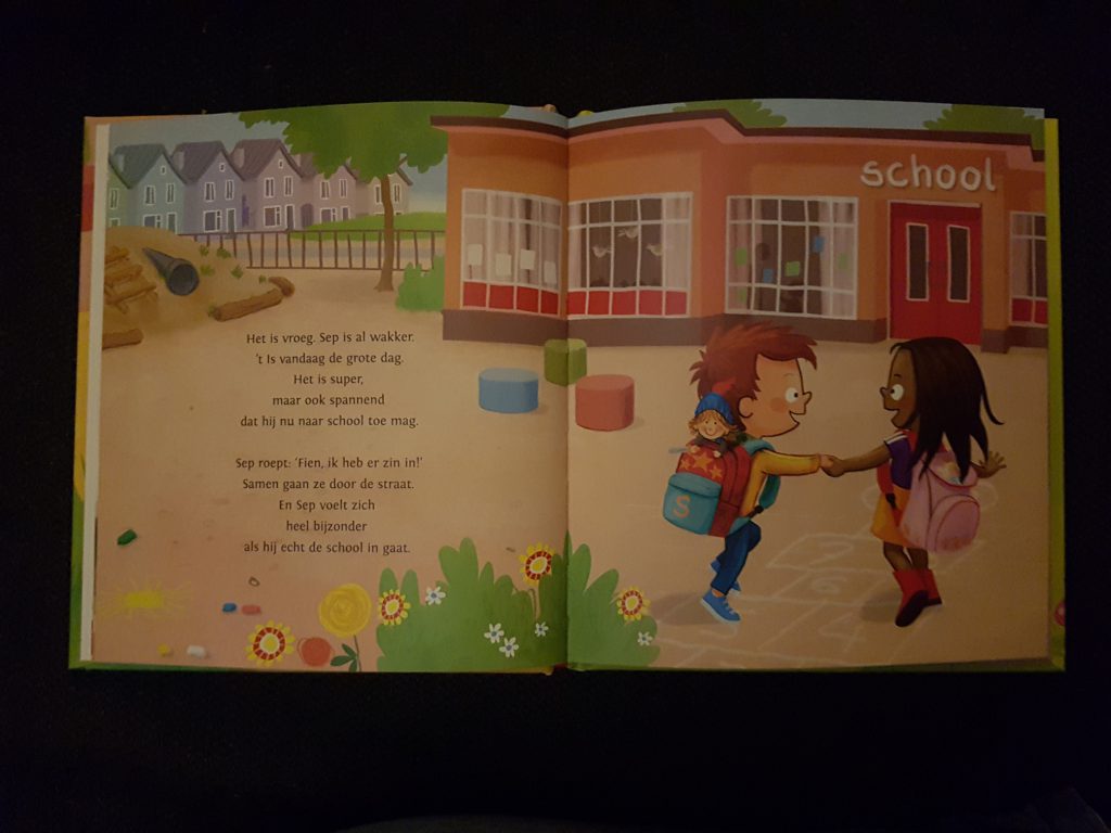 Nog 2 nachtjes slapen en dan mag Sep naar school. In de winkel mag Sep een tas uitzoeken en een beker en een trommel. Fien is mee en helpt kiezen. Op de grote dag lopen Sep en Fien hand in hand het schoolplein op. Fien zat duidelijk al op school en helpt Sep die heel verlegen is en niks durft te zeggen.