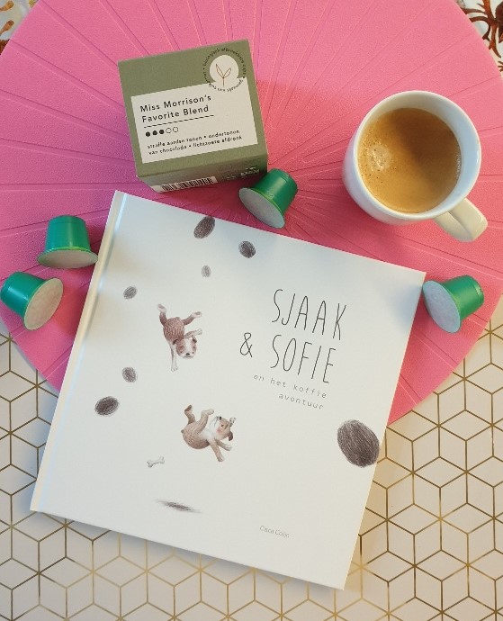 In Delft staat een koffiebranderij. Miss Morrison in de Voorstraat. Hier kun je koffiebonen halen, maar ook gemalen koffie, en cupjes en thee en chocolade en ga zo maar door. En in een huis in Delft is een dierbare herinnering ontstaan, waaruit een lief prentenboek is ontstaan. Namelijk Sjaak en Sofie en het koffie avontuur.