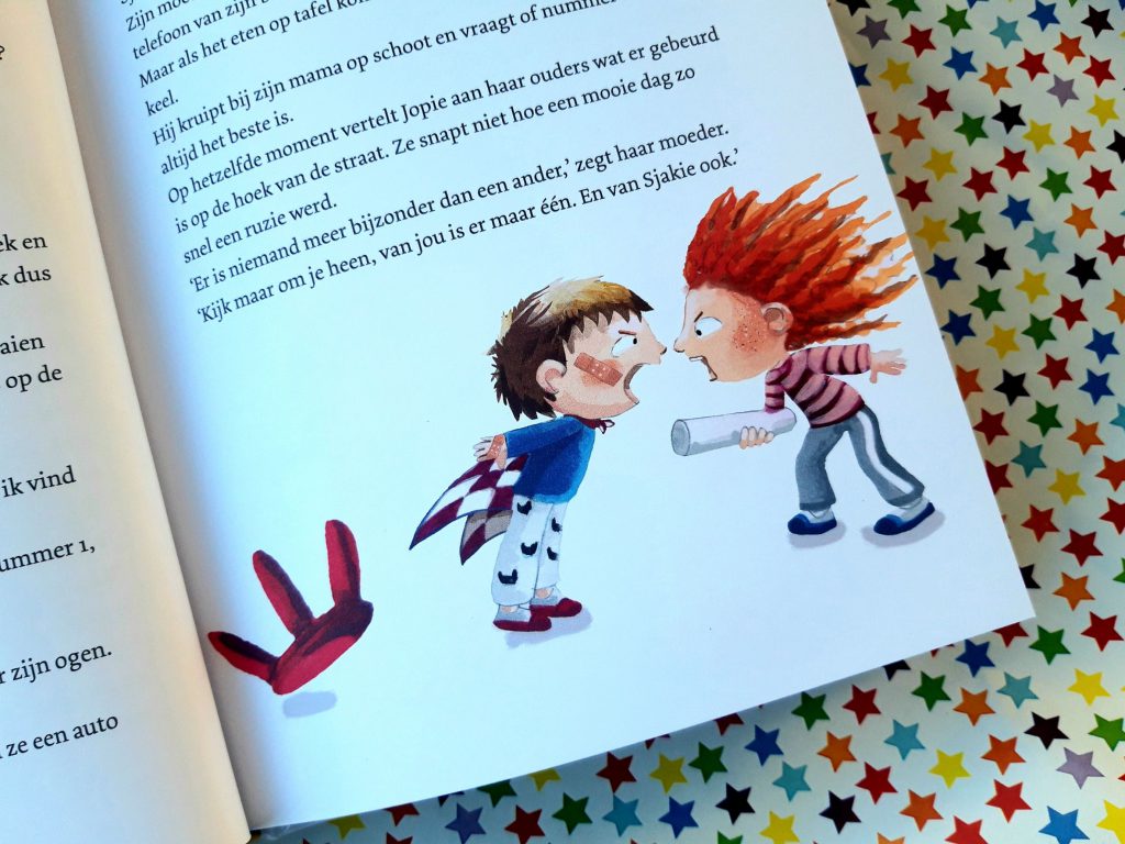 Dus wat leuk dat schrijfster Kiki Jaski deze fratsen heeft weten te vatten in dit voorleesboek over Sjakie en Jopie. Gebaseerd op haar eigen zoon en het buurmeisje, die het zo goed met elkaar konden vinden. Een maatje dat dicht bij je woont is goud waard. Dus Sjakie en Jopie zijn eigenlijk een moderne en frisse versie van Jip en Janneke.