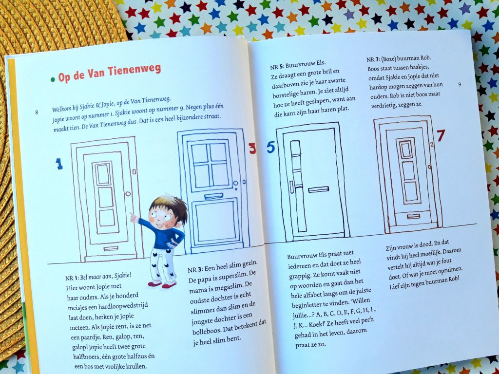 Op de Van Tienenweg wonen Sjakie en Jopie met hun gezinnen. Sjakie op nummer 1 en Jopie op nummer 9. En 1 + 9 is natuurlijk 10, dus vandaar de Van Tienenweg. In de huizen daartussen wonen nog heel veel meer mensen. Een superslim gezin, een wat verwarde buurvrouw en een boze (verdrietige) buurman. Een gevarieerd gezelschap van buren dus, waartussen Sjakie en Jopie heel fijn wonen.