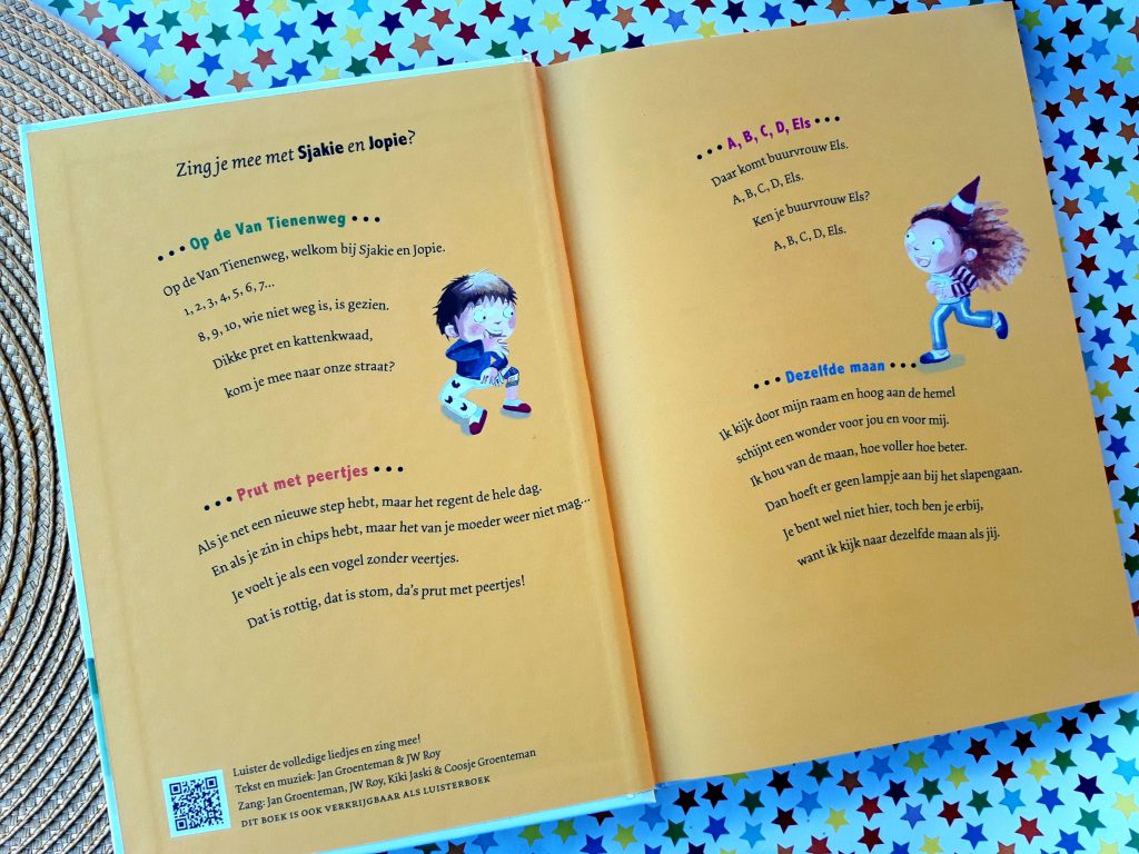 Want het toeval wil dat hun papa’s ook dezelfde interesses hebben. De vader van Jopie (JW Roy) en de vader van Sjakie (Jan Groenteman) zijn muzikanten. Via een QR-code kunnen we de volledige liedjes opzoeken. Ook de zang is een gezamenlijke aangelegenheid, met onder andere zus Coosje die in de verhaaltjes ook regelmatig voor komt. Wat een leuke uitkomst van een goed burencontact!
