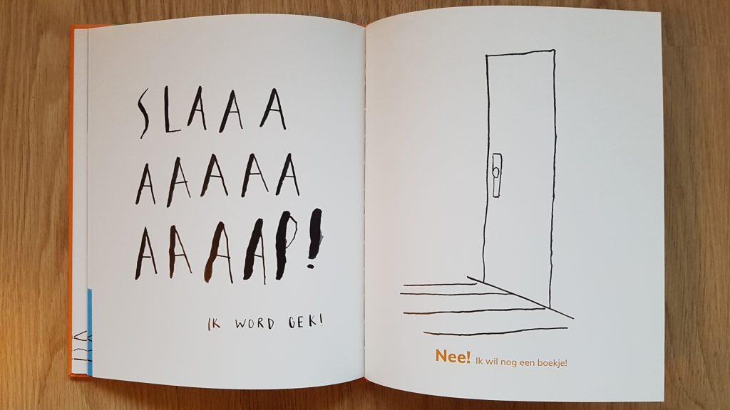 Voor elk excuus zie je een tekening met de deur van de slaapkamer van de jongen. Met op de linker bladzijde steeds de tekst van de ouder waaraan je door de grootte van de letters de irritatie ziet groeien. Erg grappig voor de voorlezer. Goed bedacht, ook voor het kind, dat de binnenkant van de slaapkamer elke keer hetzelfde in beeld is gebracht. Mijn zoontje herkende meteen dat we weer ‘binnen’ waren.