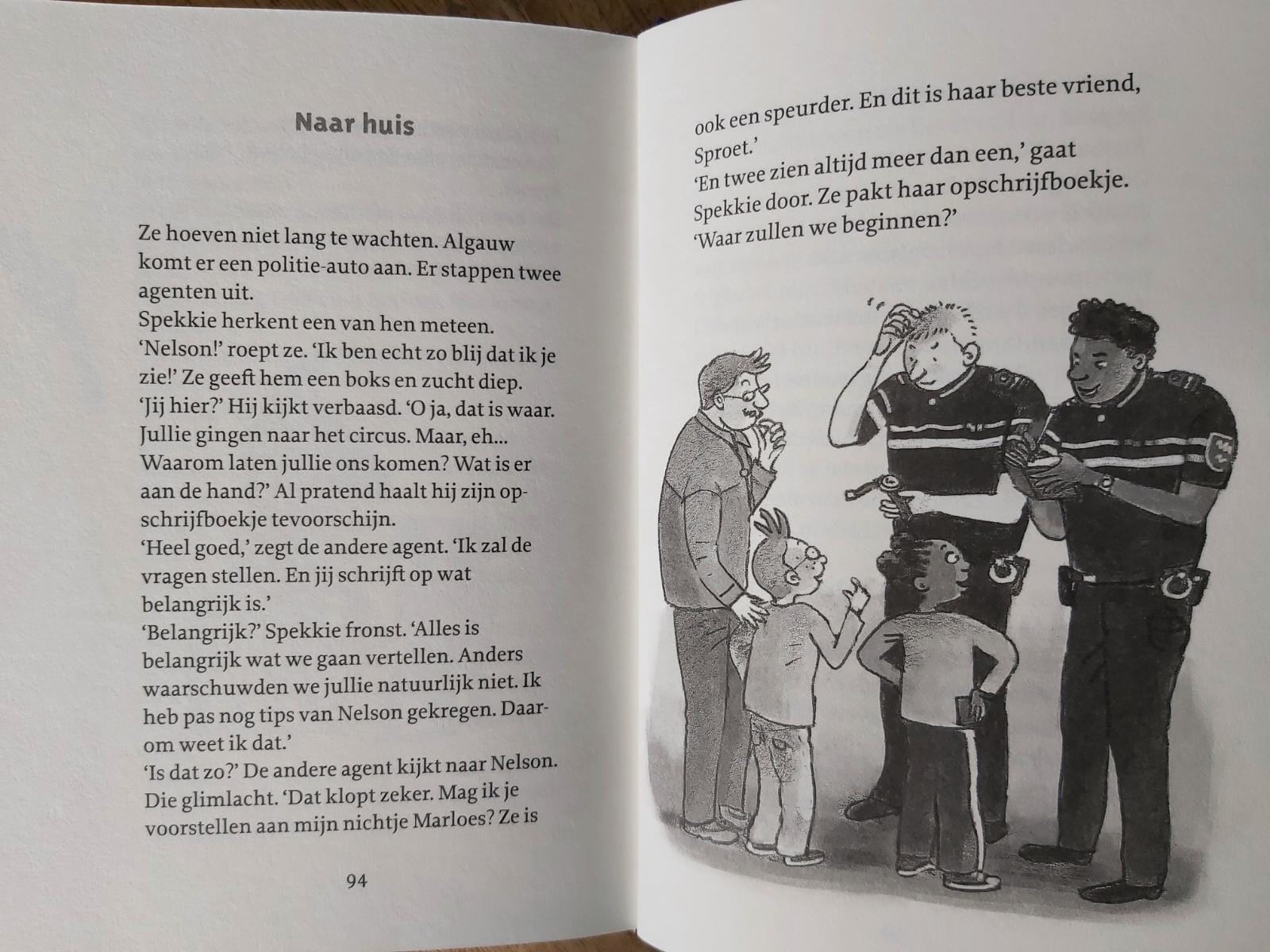 Ik wilde hem weg leggen om de volgende dag weer verder te gaan, maar dat mocht niet. Mijn kinderen wilden graag dat ik door las. Hoe gaat het aflopen en waar zijn ze nu? Heeft die messengooier het gedaan? Ze hadden genoeg vragen tijdens het voorlezen. En dat zorgt ervoor dat ze betrokken zijn. Ze ervaren het boek en dat is toch ontzettend fijn? Spekkie en Sproet is een mooie aanvulling op onze boekenkast. Ik ga zeker kijken naar de andere delen van dit duo!