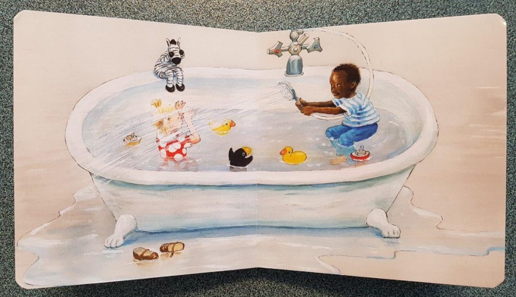 Hetzelfde geldt voor de tekeningen van een meisje dat uitgebreid met een rood waskrijtje een grote tekening maakt… op het behang. Ik ben blij dat mijn zoontje op die bladzijde wijst naar de poes die door de kier van de deur naar binnen lijkt te willen komen en niet ziet wat het meisje daar aan het doen is!