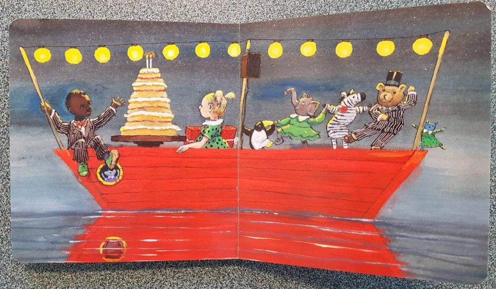 In de rest van Spelen tot het donker wordt volgen sprekende tekeningen, ter grootte van twee bladzijden. Het zouden foto’s kunnen zijn die in het dagelijks leven gemaakt worden. We zien een jarig meisje dat een groot cadeau krijgt en daarbij verzin ik dan zelf de tekst dat we binnenkort naar een verjaardag gaan en leg ik mijn zoontje van bijna 2 jaar uit hoe dat dan gaat op zo’n verjaardag.