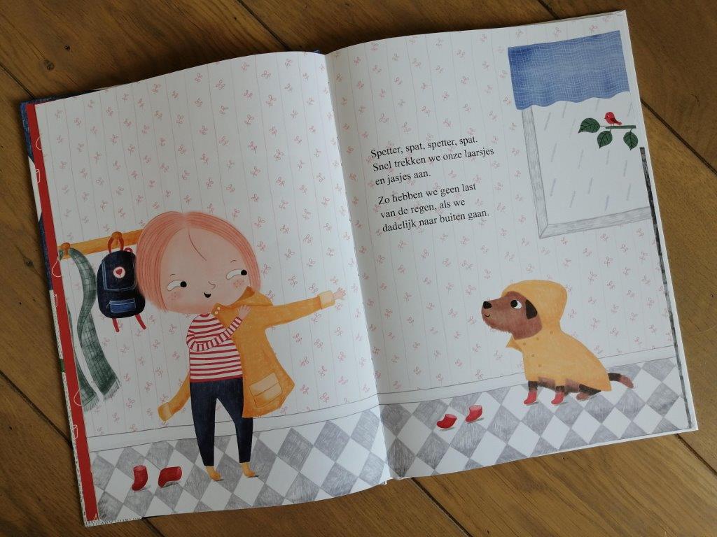 Spetter spat, alles wordt nat is een lief verhaal op rijm voor waterratjes vanaf 4 jaar’; zo kenmerkt dit boek zich. Het verhaal gaat over een kind en een hond. Ik zeg bewust kind want uit de tekst en de illustraties kan ik niet opmaken of het om een jongen of een meisje gaat. Ergens vind ik dit wel mooi; zo kan iedereen zich identificeren met het personage. Vooral in deze tijd van genderneutraal zijn is dit denk ik een mooie ontwikkeling in prentenboekenland.