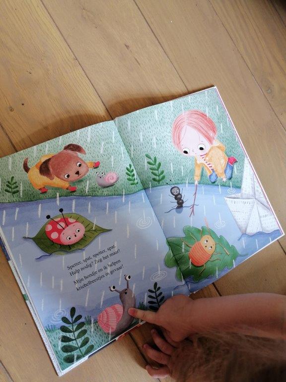 Buiten het feit dat spetter spat, alles wordt nat op rijm is geschreven wat natuurlijk prachtig is, komen er een aantal thema’s in het boek voorbij. Natuurbeleving, dieren, behulpzaam zijn, plezier hebben, samen zijn en letterlijk na regen komt zonneschijn.