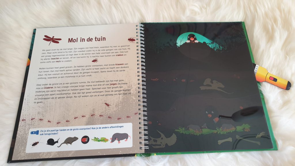 Ik hou van boeken waarbij kinderen zelfstandig aan de slag kunnen ook als ze nog niet kunnen lezen. Zoekboeken zijn daarom altijd favoriet bij jonge kinderen. Maar de speciale zaklampboeken zijn helemaal gaaf natuurlijk! Met speuren onder de grond krijgen kinderen een uniek kijkje in het leven in het donker. En laat dat nou iets magisch hebben, immers kunnen kinderen dat normaal gesproken niet zien.