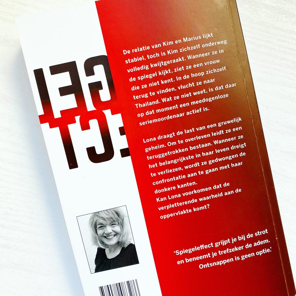 We beginnen het verhaal met iets meer snelheid dan ik ken uit Skoftig. In dat boek had ik even een aanloopje nodig. Nu duik ik meteen in het diepe en het verhaal overspoelt me. Kim slaat op de vlucht naar Thailand en je voelt de noodzaak dat dit moet slagen. De karakters van Marleen zijn niet standaard en voorspelbaar. Er zit een gelaagdheid in en zo ook bij Kim. Telkens leren we haar beter kennen, en tegelijk roept dat ook weer vragen op. Je wordt verzadigd, maar tegelijk smaakt het naar meer en wil je die hele zak met lekkere chips in 1 keer opeten. En dat doe ik dan ook, deel 1 verslind ik zonder pauze. Om vervolgens met een grote glimlach deel 1 van Spiegeleffect af te sluiten.