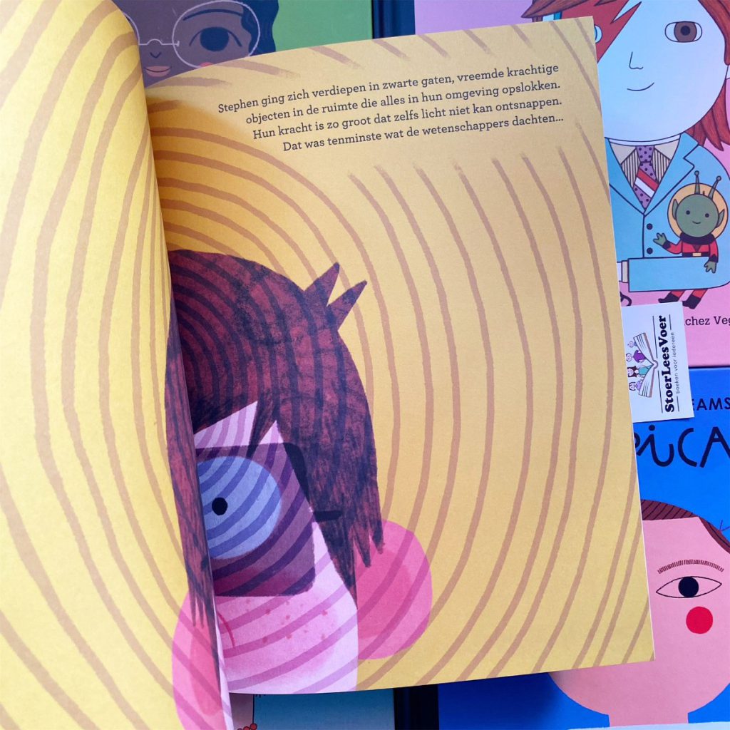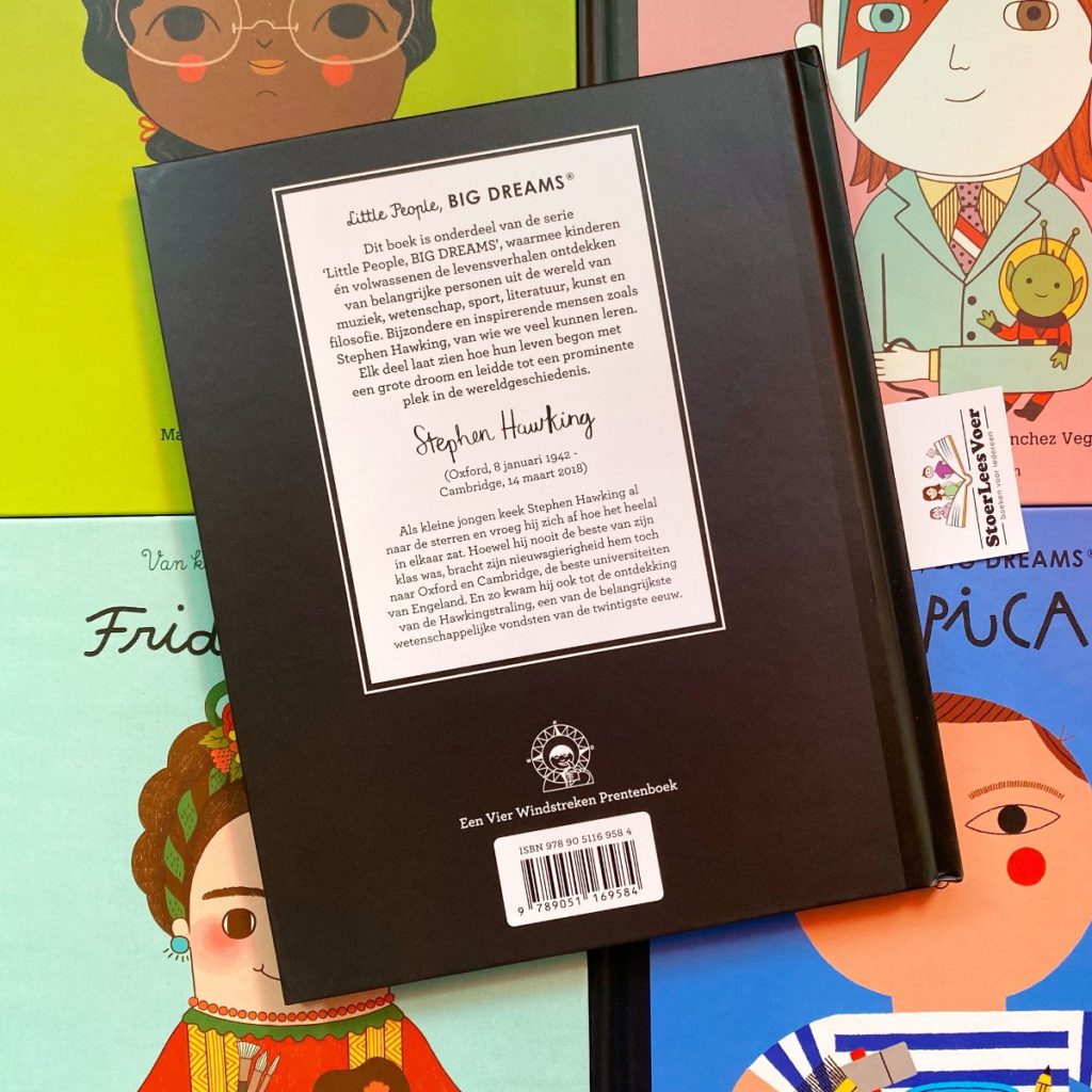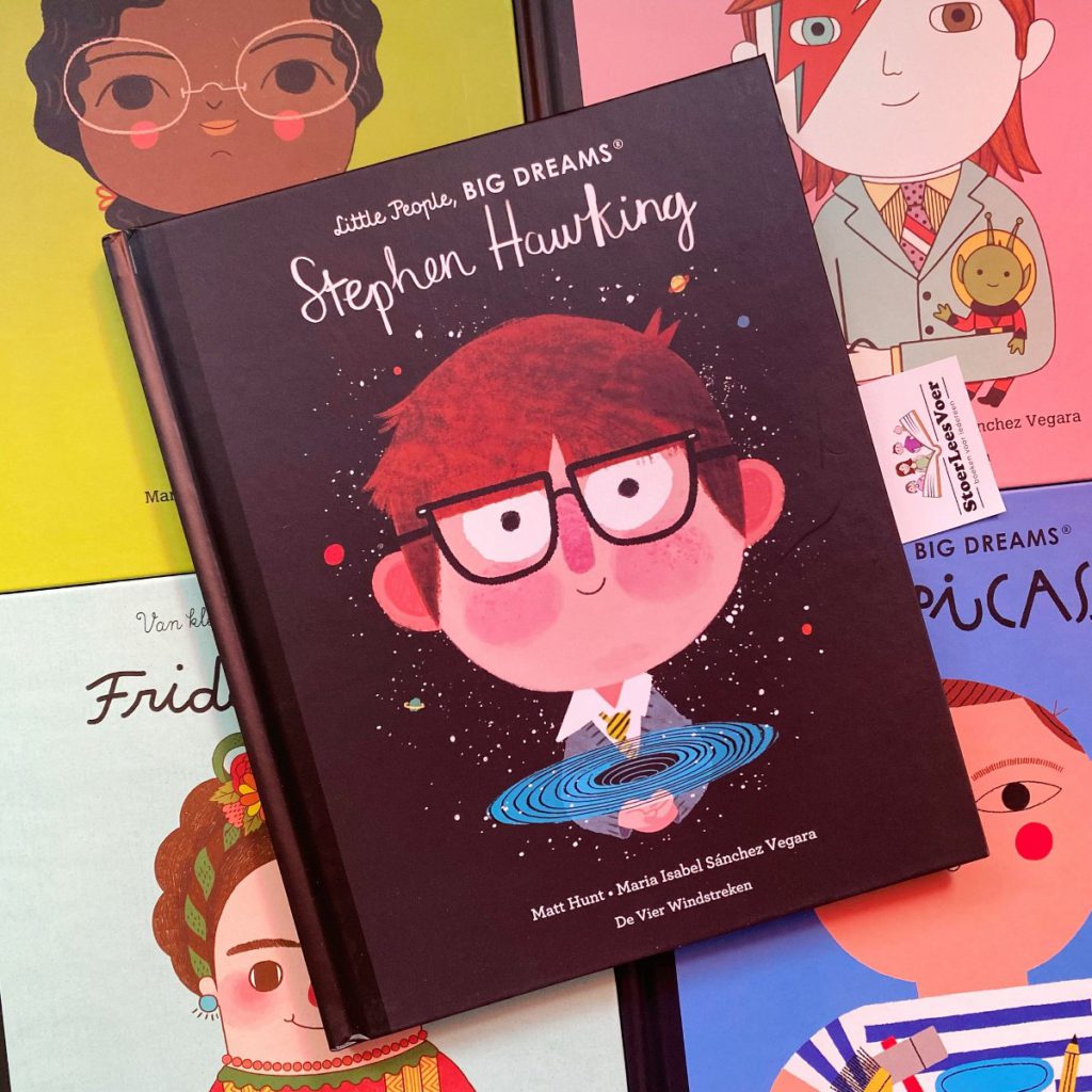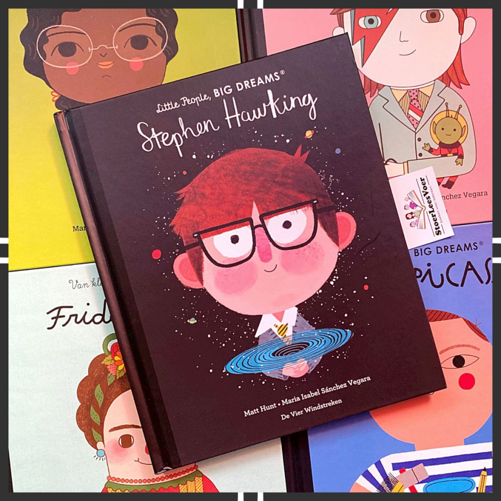 Wij zijn fan van deze boekenserie. En met wij bedoel ik mezelf als volwassene en ook mijn dochters. Als volwassene juich ik de onderwerpen toe. Het wordt zo helder en toegankelijk verwoord en verbeeld voor jonge lezers. Maar ook oudere lezers leren nieuwe dingen, ik wel althans. Deze boekenserie werd eerst ook in de boekenserietitel vertaald en uitgebracht onder: ‘Van klein tot groots’. Waarom en wanneer dit is aangepast is me niet helemaal duidelijk. Ik zie het verschil in de boeken die ik heb, waardoor het me is opgevallen. De Little People, Big Dreams boekenserie is trouwens gigantisch. Er blijven maar delen komen. Eerst alleen met vrouwen, toen kwam David Bowie als eerste man. En langzaam is het uitgegroeid tot een geweldige collectie van bijzondere mensen. Met nu Stephen Hawking!