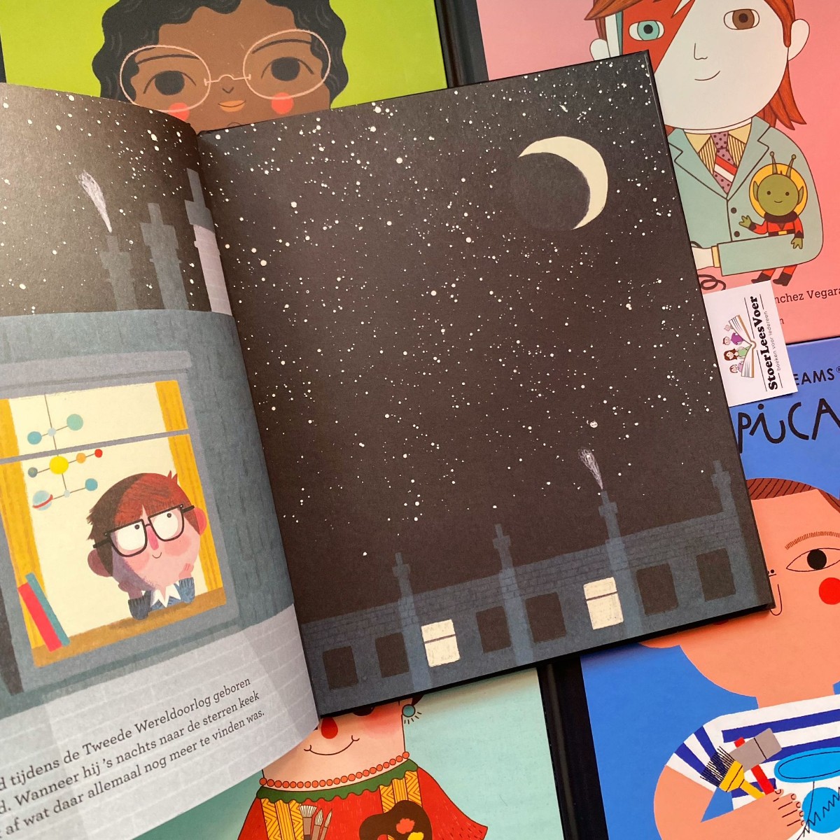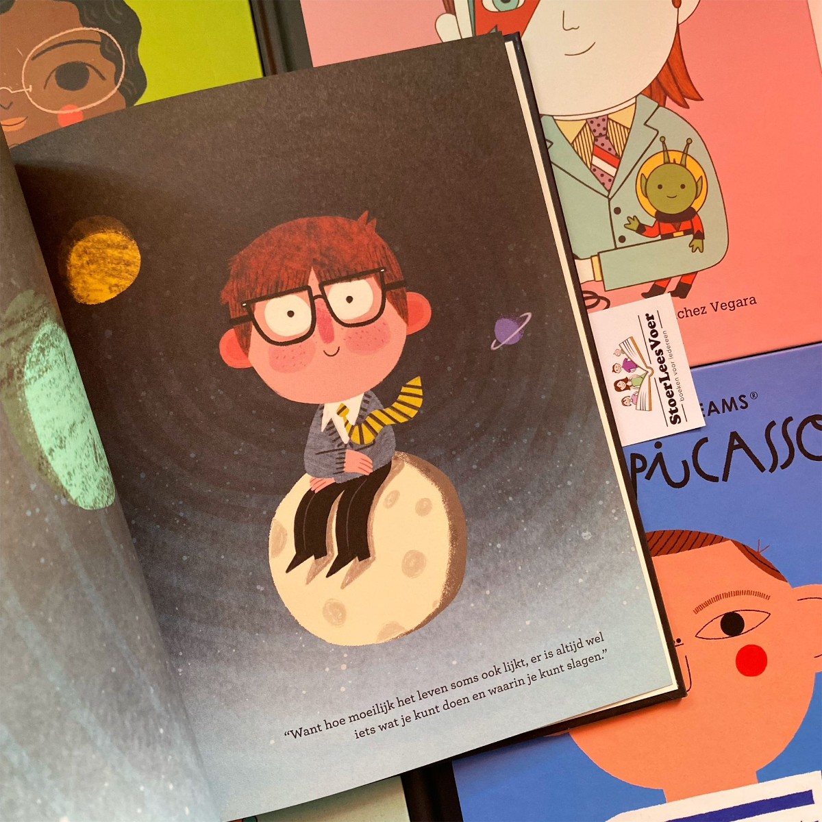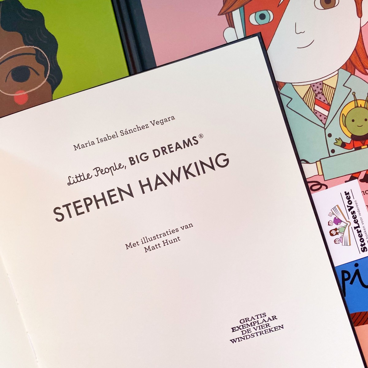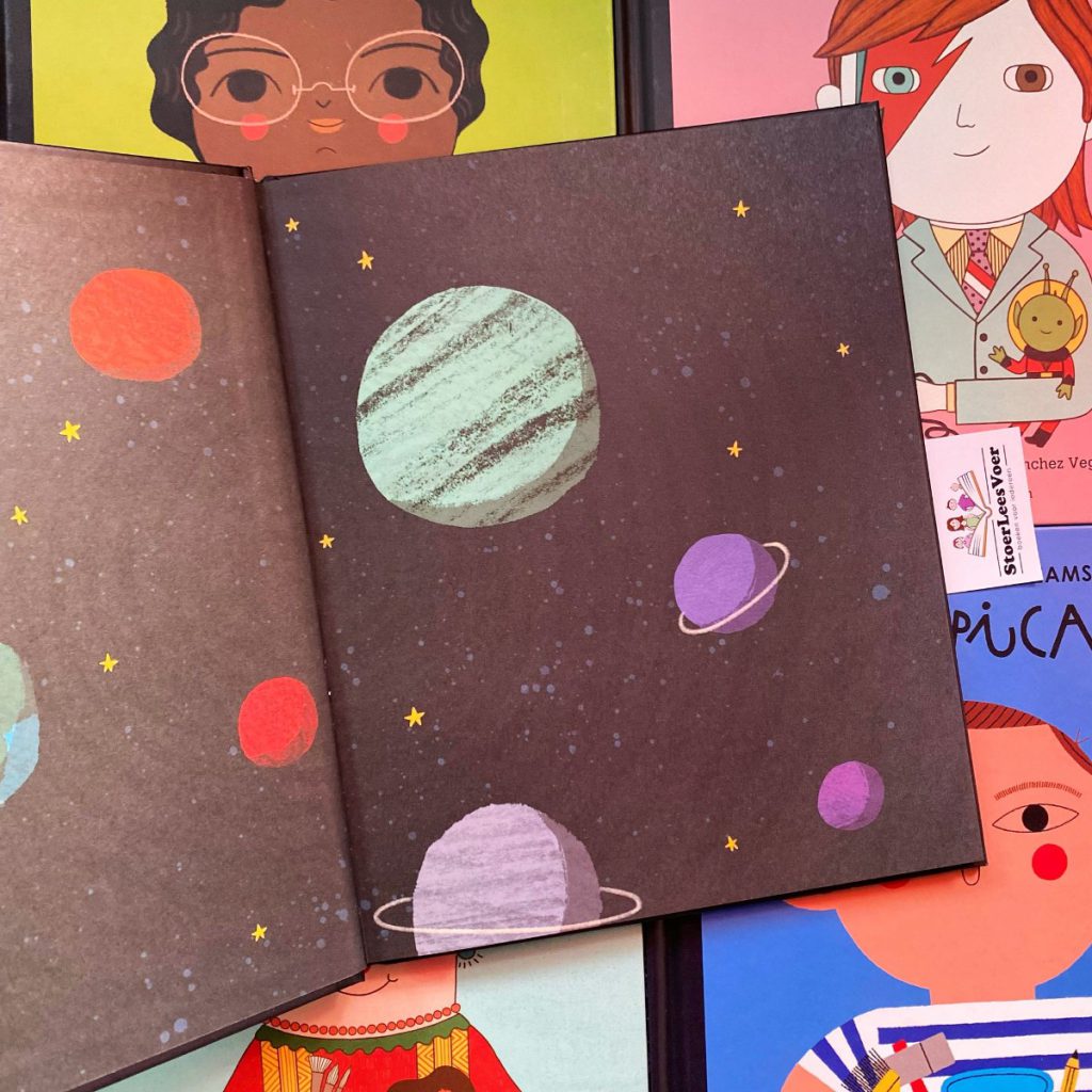Wij zijn fan van deze boekenserie. En met wij bedoel ik mezelf als volwassene en ook mijn dochters. Als volwassene juich ik de onderwerpen toe. Het wordt zo helder en toegankelijk verwoord en verbeeld voor jonge lezers. Maar ook oudere lezers leren nieuwe dingen, ik wel althans. Deze boekenserie werd eerst ook in de boekenserietitel vertaald en uitgebracht onder: ‘Van klein tot groots’. Waarom en wanneer dit is aangepast is me niet helemaal duidelijk. Ik zie het verschil in de boeken die ik heb, waardoor het me is opgevallen. De Little People, Big Dreams boekenserie is trouwens gigantisch. Er blijven maar delen komen. Eerst alleen met vrouwen, toen kwam David Bowie als eerste man. En langzaam is het uitgegroeid tot een geweldige collectie van bijzondere mensen. Met nu Stephen Hawking!