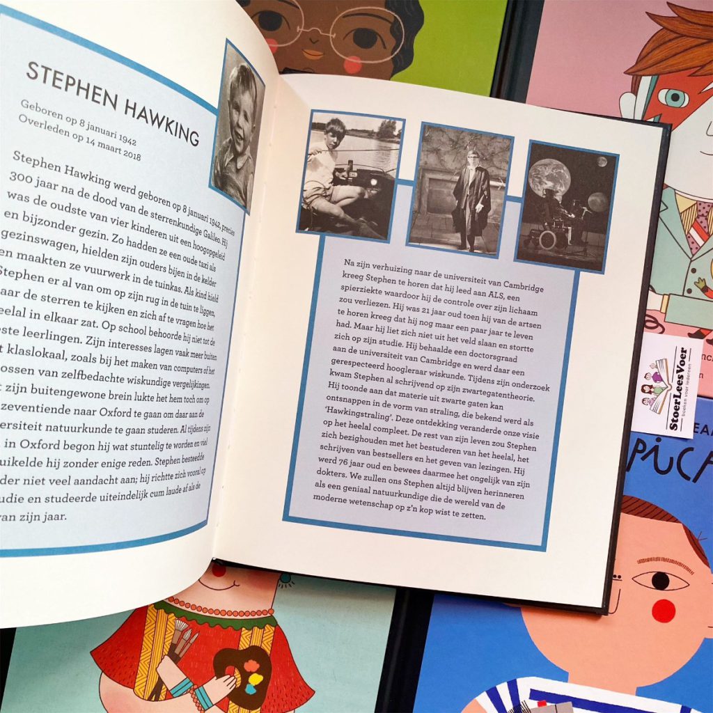 Achterin zit altijd nog een extra stuk informatie. Dit vind ik een fijne toevoeging, hiermee ga je nog wat meer de diepte in. Zo lees ik dat Stephen Hawkings zijn ouders al bijzonder waren. Ze hadden een oude taxi als gezinswagen, hielden ze bijen in de kelder en maakten ze vuurwerk in de tuinkas. Je leest verder mee hoe Hawkings tot de ontdekking van zijn ALS komt. Dit is een spierziekte waardoor hij uiteindelijk in zijn kenmerkende rolstoel terechtkwam en met een robotstem sprak.