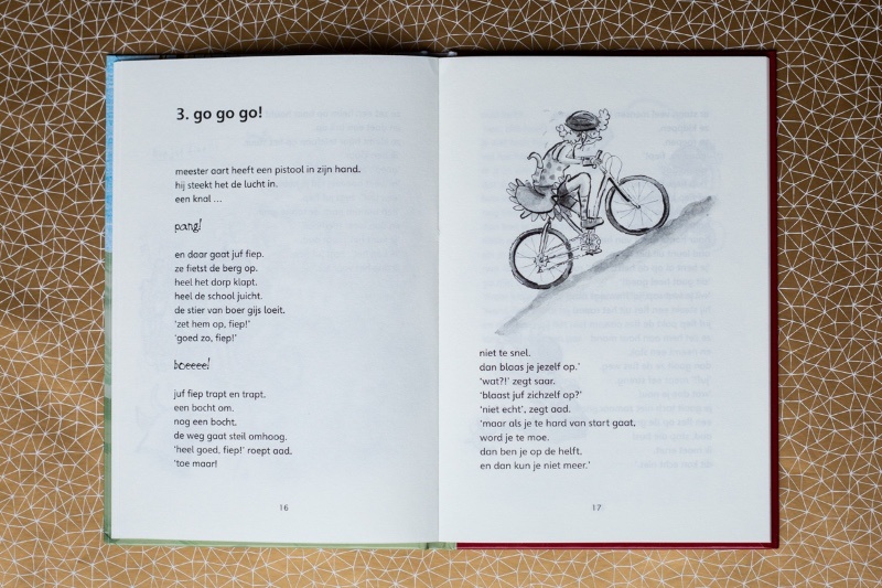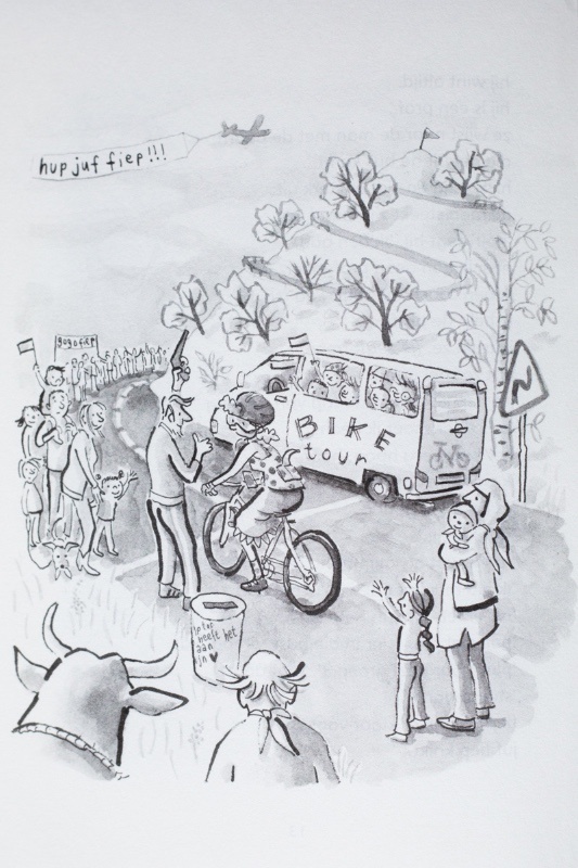 juf fiep remt zo hard dat er rook van het wiel komt. maar de stier blijft staan. hij stormt op juf fiep af. hij neemt haar op de hoorns! o nee! juf slaat over de kop! ze rolt met fiets en al van de berg af. bonk bonk bonk