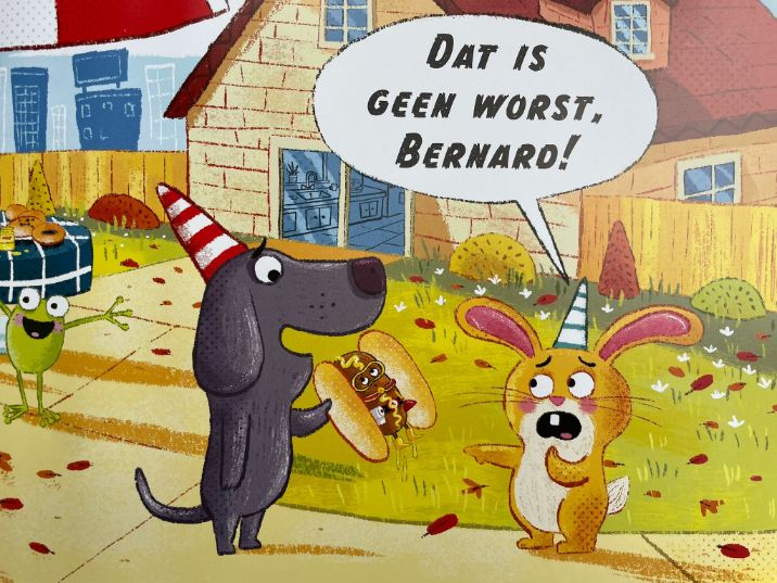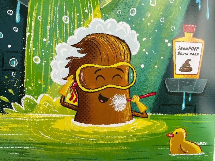 Ik had het al eerder genoemd. Een boek dat over poep gaat, is voor de meeste kinderen sowieso al wel grappig. Maar ook voor de volwassenen is het een grappig boek om voor te lezen, want er zitten leuke woordspelingen en andere grapjes in verwerkt. Denk bijvoorbeeld aan ‘shampoep’ (speciaal voor bruin haar). Ook heb ik smakelijk gelachen om Superpoep die op het barbecue feestje tussen een broodje klem komt te zitten, en wordt aangezien voor een worstje.