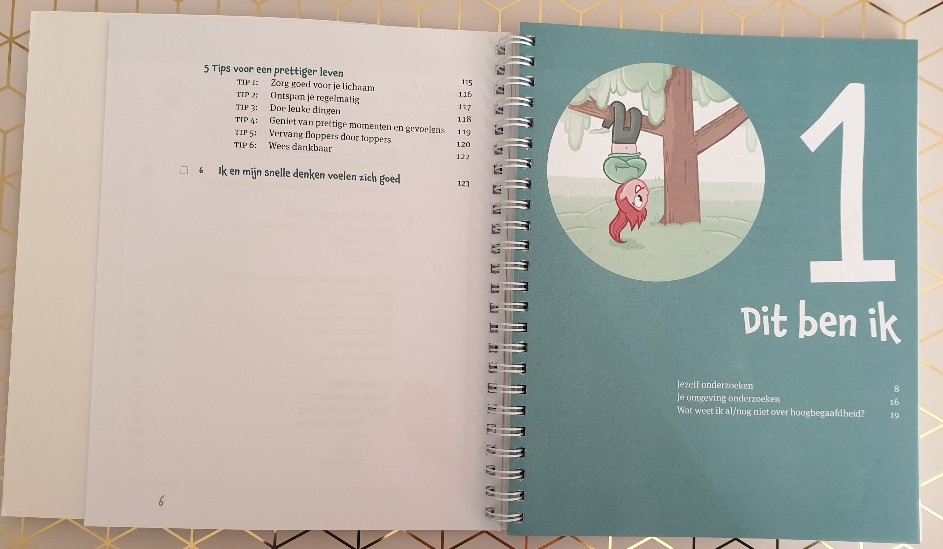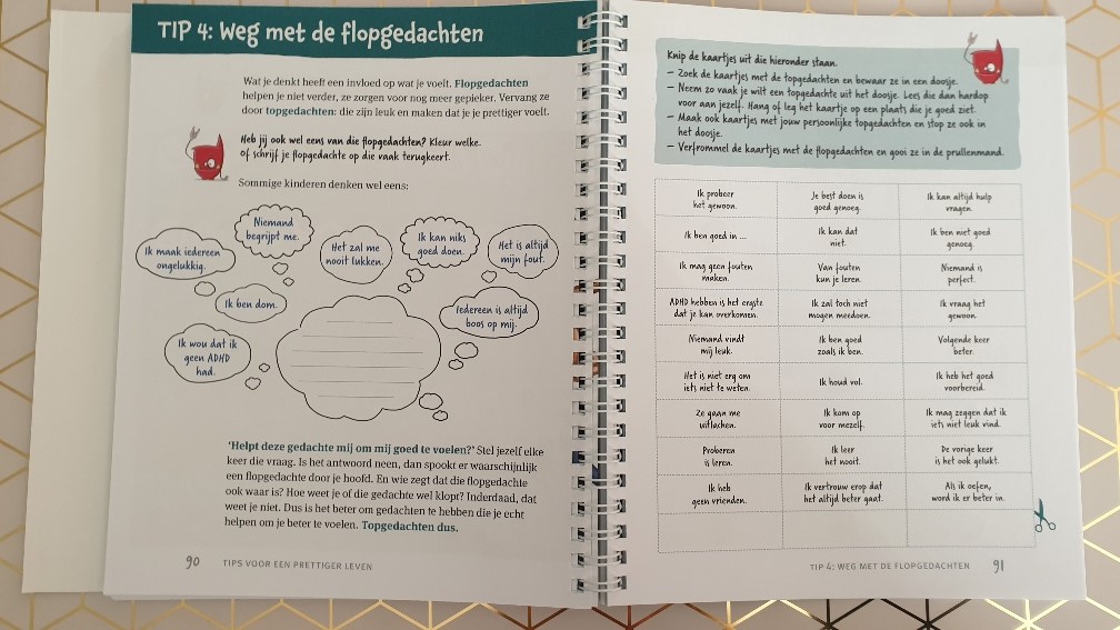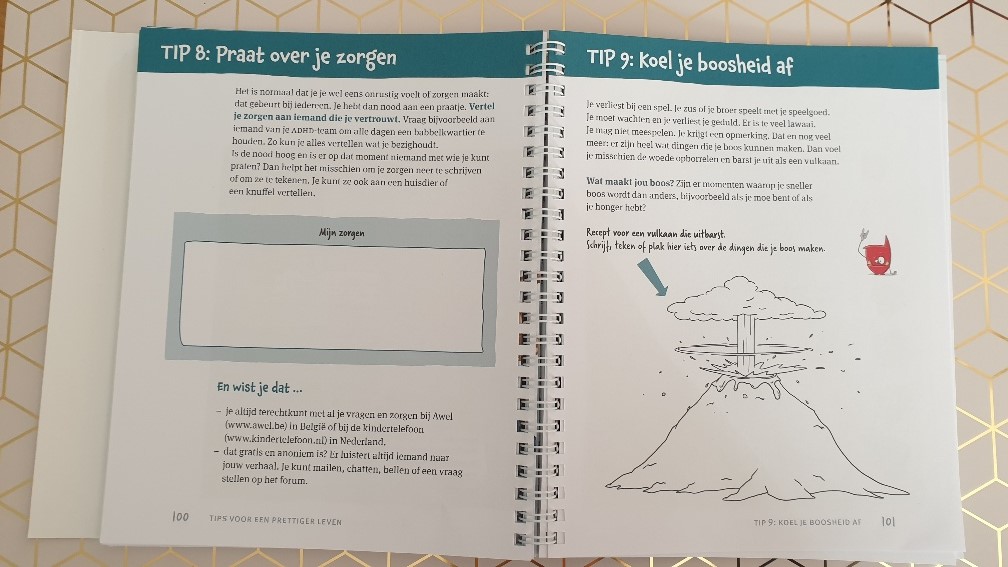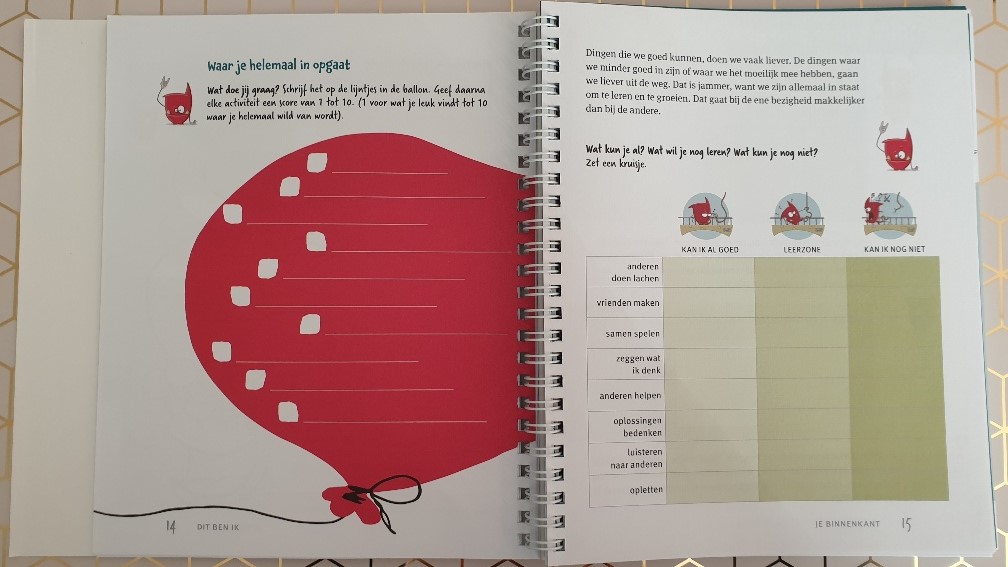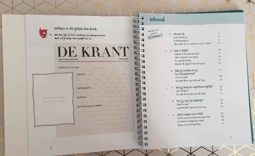 Het boek begint heel duidelijk met ADHD aan de binnenkant en aan de buitenkant. Je kan kijken naar je kwaliteiten en naar je valkuilen. Iets wat ik zelf bijvoorbeeld heel fijn vind aan een ADHD’er zijn, is dat ik enthousiast, snel, creatief en nieuwsgierig ( in de zin van leergierig) ben. Maar de valkuilen zijn ook dat ik impulsief ben, heel kwetsbaar, ongeduldig en soms wat chaotisch ben. Tal van opdrachten volgen om kinderen zichzelf goed te leren begrijpen.