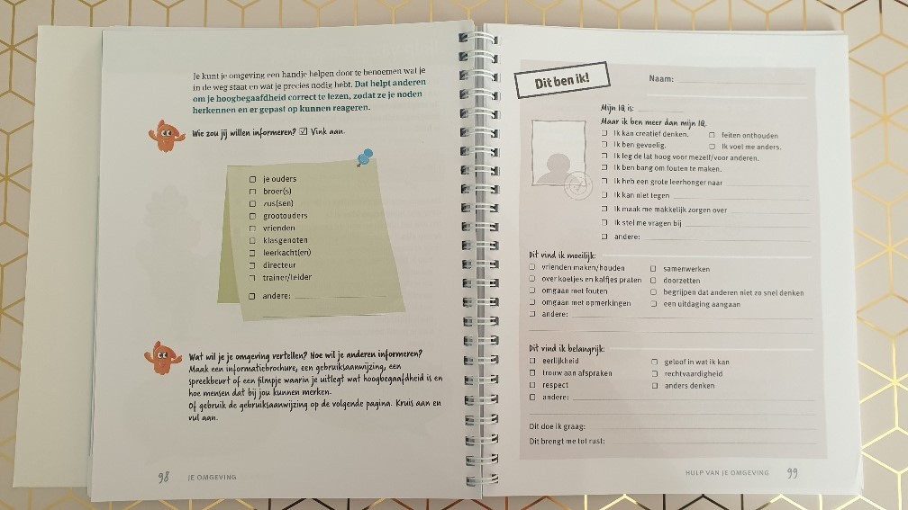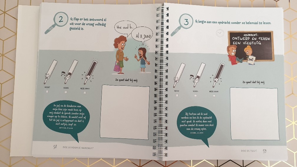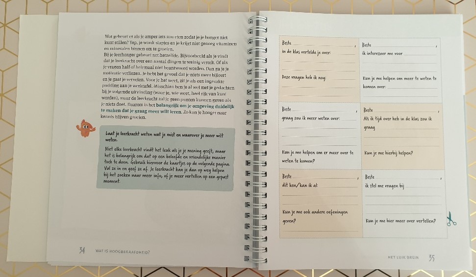 We zijn dan ook met dit doeboek voor temperamentvolle gevoelige slimme kinderen begonnen waarbij ik haar uitleg dat ze officieel niet hoogbegaafd is, maar wel heel erg slim en waarschijnlijk heel veel informatie uit dit boekje kan halen. Ze geniet van de vragenlijstjes, stagneert bij de teken verder opdrachten ( want dat is toch veel te moeilijk), moet heel hard lachen om de plaatjes en wil dat ik de briefjes voor de juf 30 keer kopieer en in haar rugzak stop.
