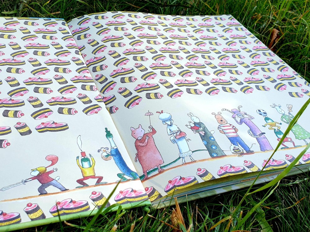 Ik hou ervan als boeken net even anders zijn dan andere. Zo lazen wij al met veel plezier Het boek zonder tekeningen. Taart voor iedereen past zeker in dit zelfde rijtje unieke en net even anders dan andere boeken. Het boek is woordloos waardoor je je fantasie zal moeten aanspreken. Nu kun je natuurlijk als volwassenen zelf wat verzinnen, maar eigenlijk is het veel leuker om je kind te vragen wat er gebeurd. Jonge kinderen zullen vooral benoemen wat ze zien. Terwijl oudere kinderen hun eigen verhaal verzinnen. Mijn dochter van zes vond het prachtig dat zij mocht bedenken hoe het verhaal ging. En ze was daarna ook heel nieuwsgierig naar hoe ik het verhaal zou verzinnen. En dat is precies waarom dit prentenboek zo leuk is. Door de vele details zie je elke keer wat nieuws. En is het verhaal dus ook net weer even anders!
