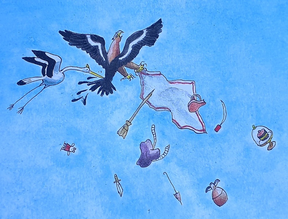 Een divers dierengezelschap komt bij elkaar. De dieren schrikken als een roofvogel hun spullen steelt, maar dat is zeker niet alles dat er gebeurd.