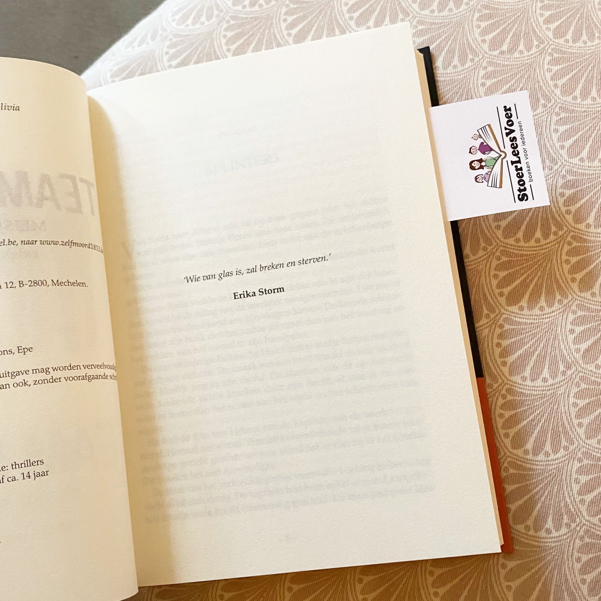 ”Niemand wist dat haar naam Erika Storm was. Niemand wist dat ze geen normale tiener was. Dat ze officieel dood was, verdronken volgens haar dossier, en dat ze slechts sporadisch weer boven water kwam. In een of ander Europees land. Om een case of undercoverklus op te lossen en net zo snel weer te verdwijnen… en op te gaan in rook. Ze was niemand meer.” Team Mortis: Meisje van glas is het twaalfde deel en brengt ons dit keer een zeer breekbare zaak.