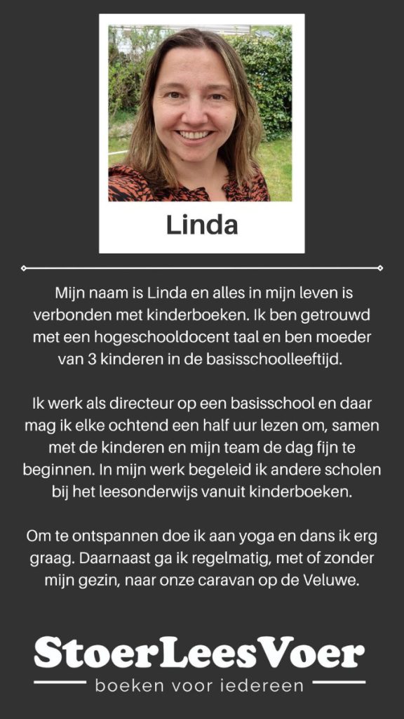 Mijn naam is Linda (39) en alles in mijn leven is verbonden met kinderboeken. Ik ben getrouwd met een hogeschooldocent taal en ben moeder van 3 kinderen in de basisschoolleeftijd. Ik werk als directeur op een basisschool en daar mag ik elke ochtend een half uur lezen om, samen met de kinderen, mijn team en onze schoolhond, de dag fijn te beginnen.