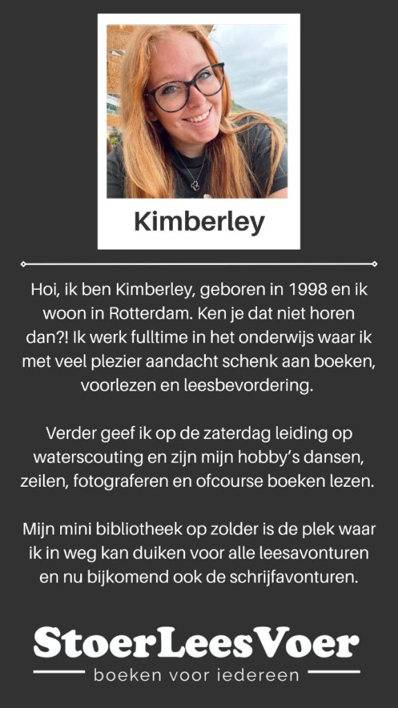 Hoi, ik ben Kimberley, geboren in 1998 en ik woon in Rotterdam. Ken je dat niet horen dan?! Ik werk fulltime in het onderwijs waar ik met veel plezier aandacht schenk aan boeken, voorlezen en leesbevordering.