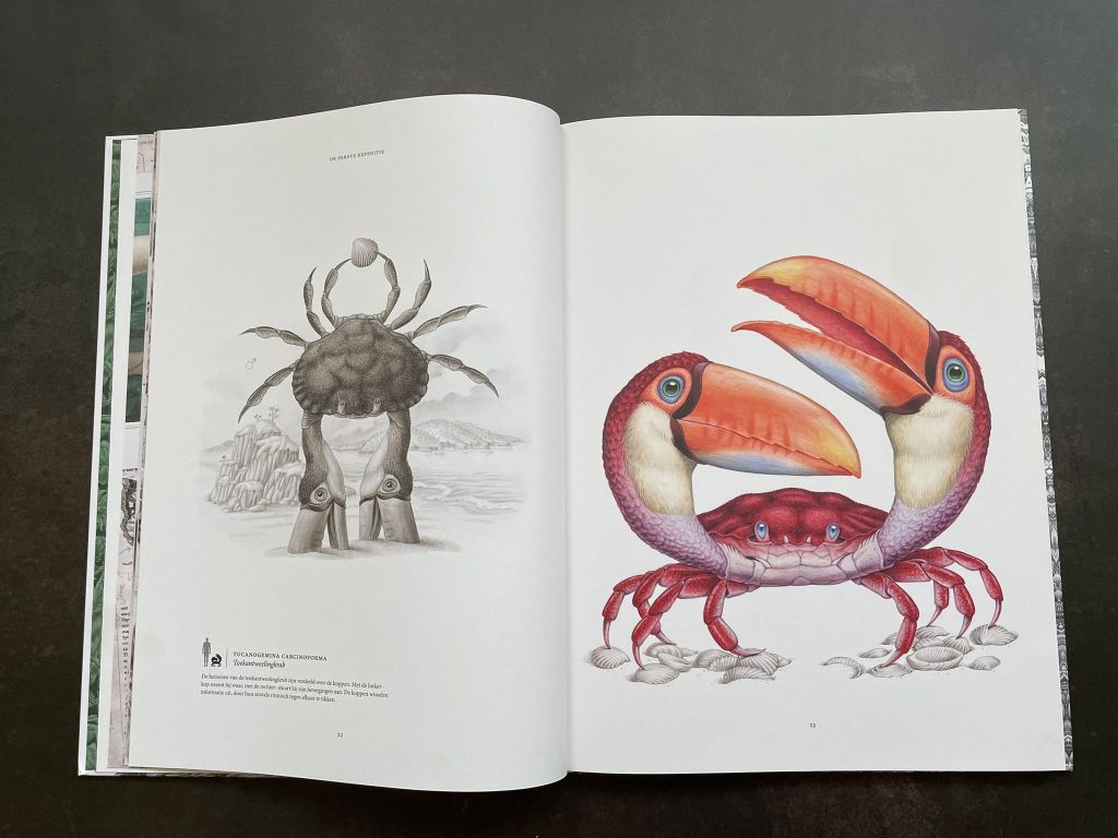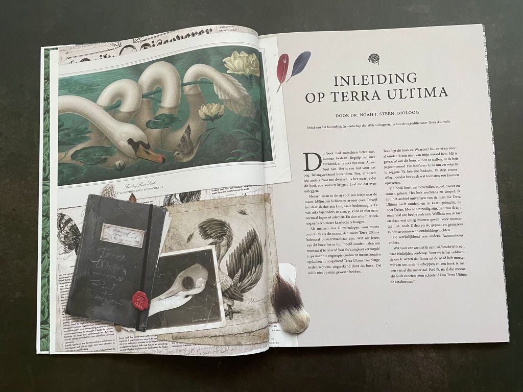 Ik heb een zwak voor mooie boeken. En dit is zo’n boek. Want Terra Ultima is prachtig, vanaf het begin tot het eind. De kaft is ontzettend aantrekkelijk. Dit is een prachtige zwart-wit illustratie. En hoe langer je kijkt, hoe meer van de dieren je zult ontdekken die Raoul Deleo op zijn ontdekkingsreizen is tegengekomen. Maar wanneer je het boek openslaat, valt je mond echt even open van verbazing. Wauw! (en nog eens wauw…). Het boek heeft wat weg van een ouderwetse encyclopedie of reisverslag. Het bevat landkaarten, een stamboom, brieven, krantenknipsels, tekeningen, notities en nog veel meer. Het doet gewoon levensecht aan! En dat maakt dat dit boek je weer doet twijfelen aan je eigen perceptie van de werkelijkheid. (en wie weet… nog lang niet alles is ontdekt)