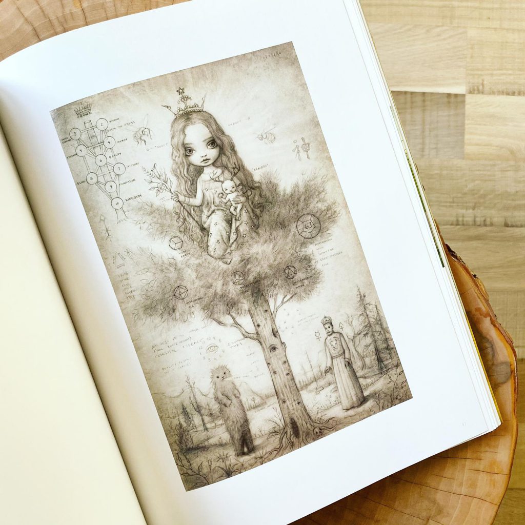Het boek The Tree Show neemt ons mee in de wereld van Mark Ryden. Je ziet zijn invloeden en prikkels. Tegelijk zie je schetsen die leiden tot het uiteindelijke kunstwerk. In het hoofdstuk ‘paintings’ zien we zijn prachtige werken, bomvol knipogen en symboliek. Tree of life is echt mijn favoriet van de kunstwerken. Er valt zoveel te zien en de ogen van de queen zijn gewoon prachtig. Leuk weetje is dat hij ook zijn eigen lijsten ontwerpt en met de hand laat maken. Daar zit dus zoveel details en kunst in. Prachtig!