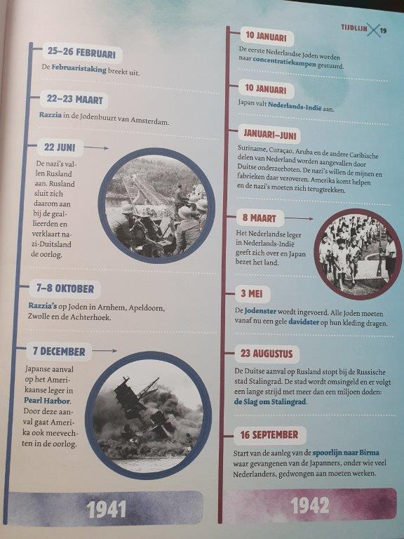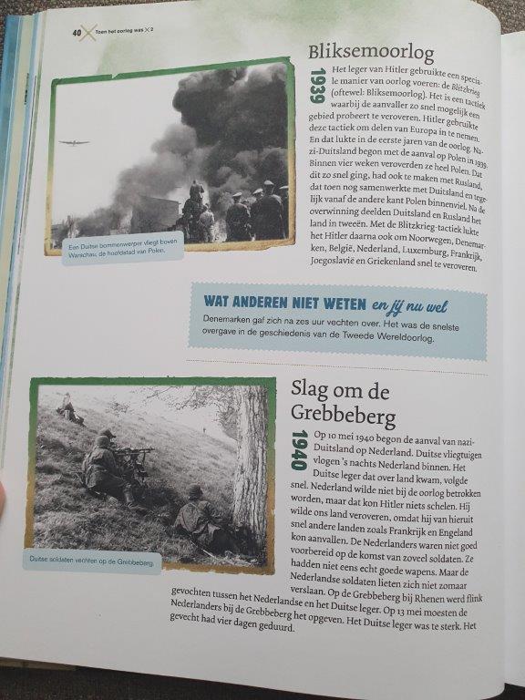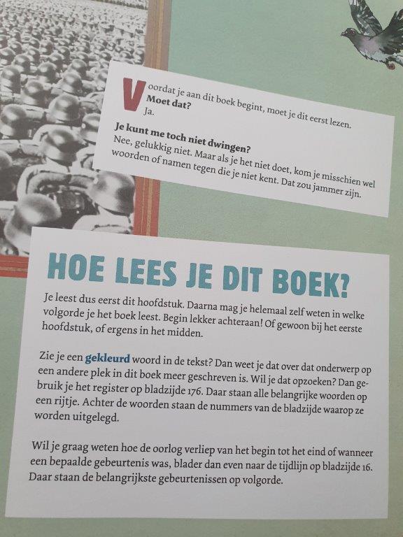 Toen het Oorlog was, 1939-1945 blijkt een informatief boek waarin kinderen in de bovenbouw aan de hand van de makers meenemen in allerlei facetten van de Tweede Wereldoorlog. Het begint al goed met een ‘wenk’ zoals ik dat dan maar noem. ‘Hoe lees je dit boek?’ met daarin de functie van de gekleurde woorden. Die kun je opzoeken achterin het boek. Een verwijzing naar de tijdlijn volgt.